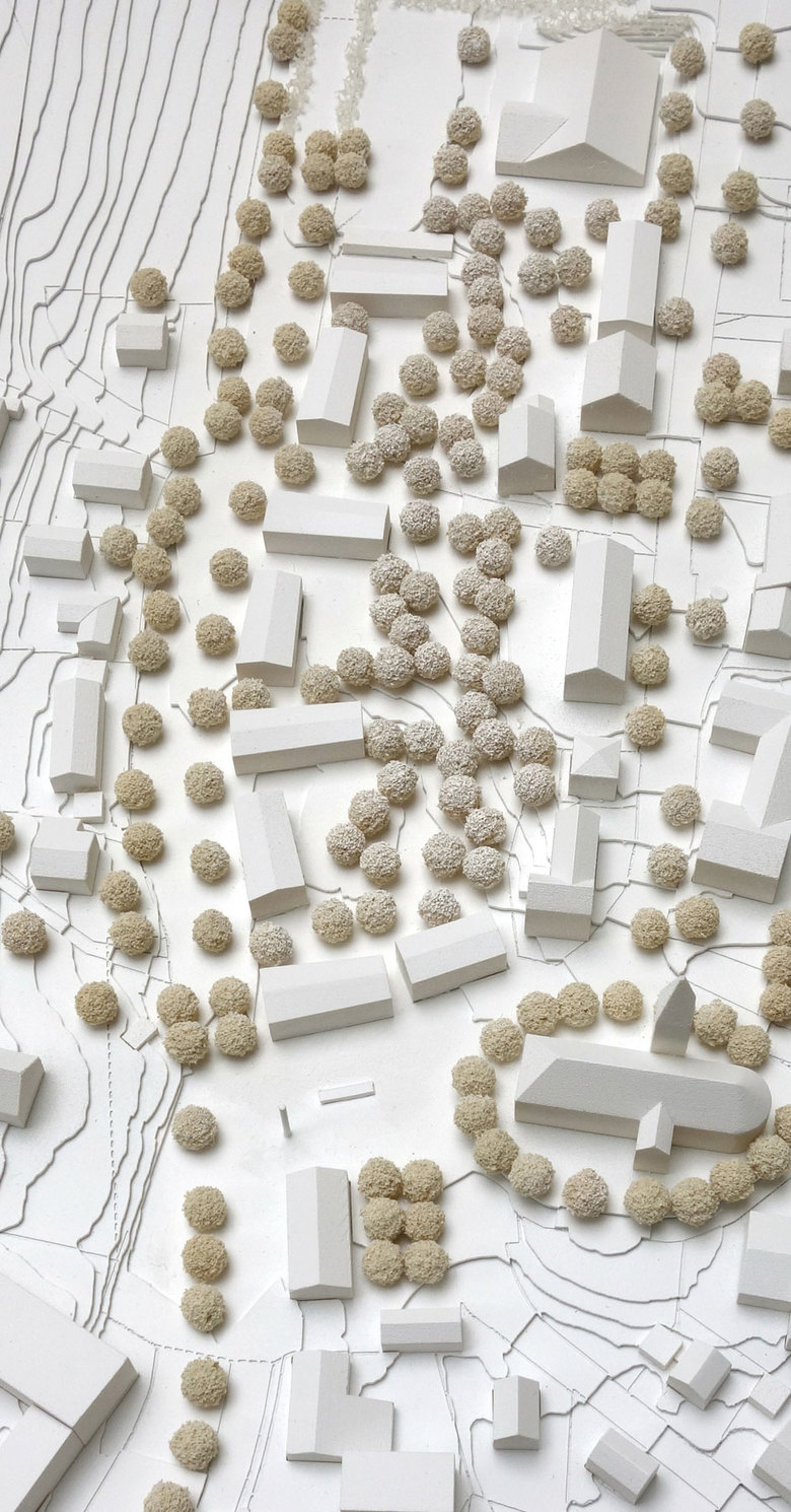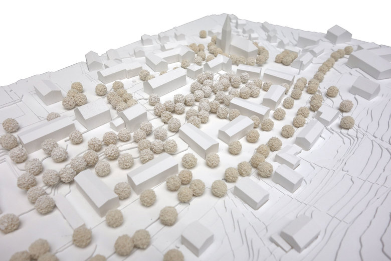 In Nord-Südrichtung soll ein neuer Pfad entstehen, der u.a. den Parkierungsbereich unter Bäumen mit Spiel- und Aufenthaltsflächen verbindet - der Waltenhofener Dorfpfad. Von diesem zentralen Pfad gehen Verästelungen der Wege zur Immenstädter und zur Rathausstrasse. Es entsteht ein feinmaschiges Netz aus Wegeverbindungen, um auf kurzem Weg alle innerdörflichen Bereiche miteinander zu verbinden. Westlich des zentralen Grünbereiches entstehen im Anschluss an die Neubauten an der Immenstädter Strasse Gärten als Freibereiche der dort möglichen Wohnnutzungen. Bebauung und Grün verzahnen sich.