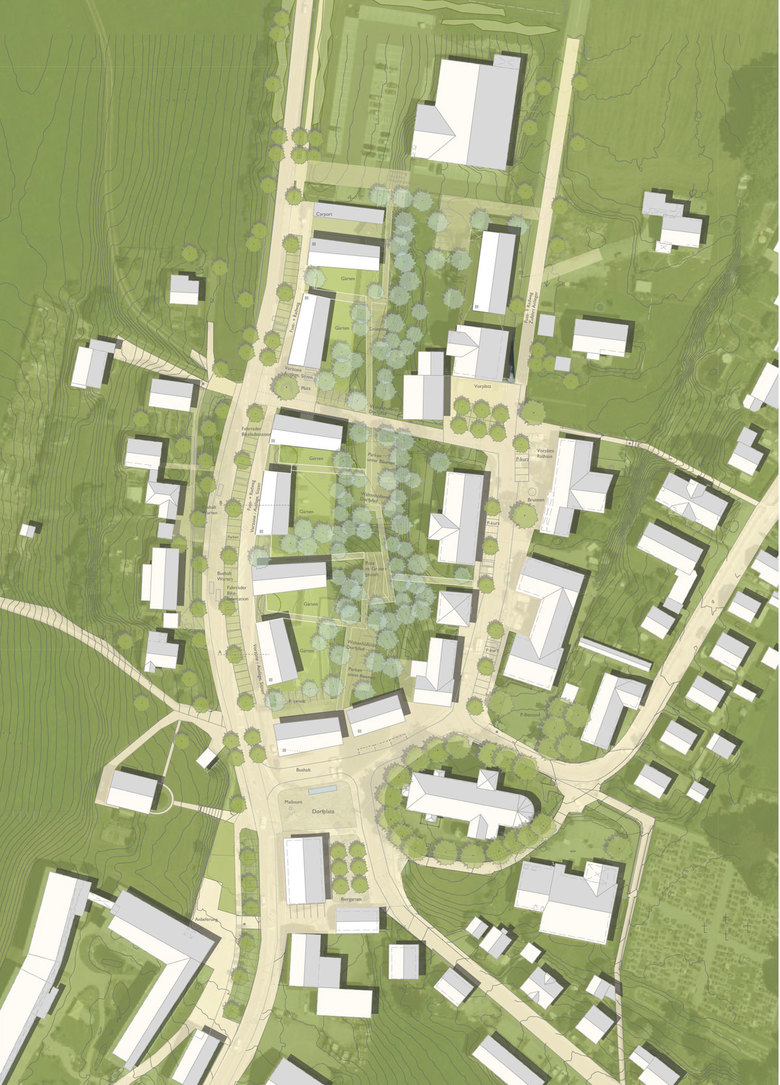 Die Immenstädter Strasse erhält zur Reintegration in den Ort als Dorfstraße eine Randbebauung aus alternierend trauf- und giebelständigen Gebäuden, die den neuen geschwungenen Verlauf nachzeichnen. An wichtigen Querungen wird die Bepflanzung mit Baumgruppen verdichtet, um den Strassenverlauf zu rhytmisieren. Auf der Ostseite der Strasse wird ein grüner, multifunktionaler Streifen für Parkierung, Fahrradabstellplätze, E-Bikeladestationen Bushaltestellen etc. angeordnet. Durch die ein- und ausparkenden PKW verlangsamt sich der Verkehr auf der Immenstädter Strasse.