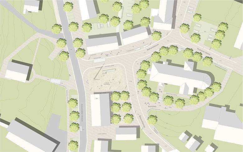Dieser wird südlich begrenzt durch den Gasthof Hasen mit einer baumüberstandenen Freischankfläche und einer neuen Randbebauung aus dreigeschossigen Gebäuden für Dienstleistungsnutzungen, ggf mit Wohnungen in den Obergeschossen. Zentrales Platzelement bildet der Maibaum und ein Wasserbecken mit Sitzrand den Abschluss zur Fahrbahn der Rathausstraße. Das Pfarramt westlich der Immenstädter Strasse bleibt in seiner dominanten Wirkung dem Sichtfeld des Platzes erhalten.