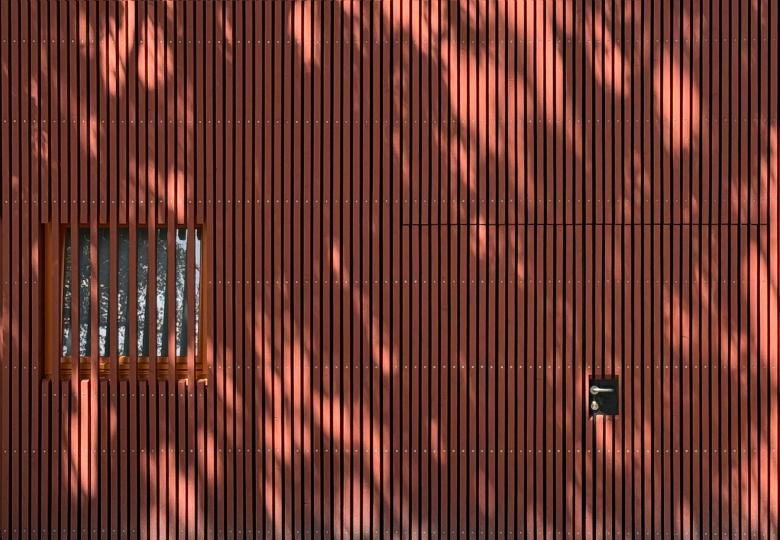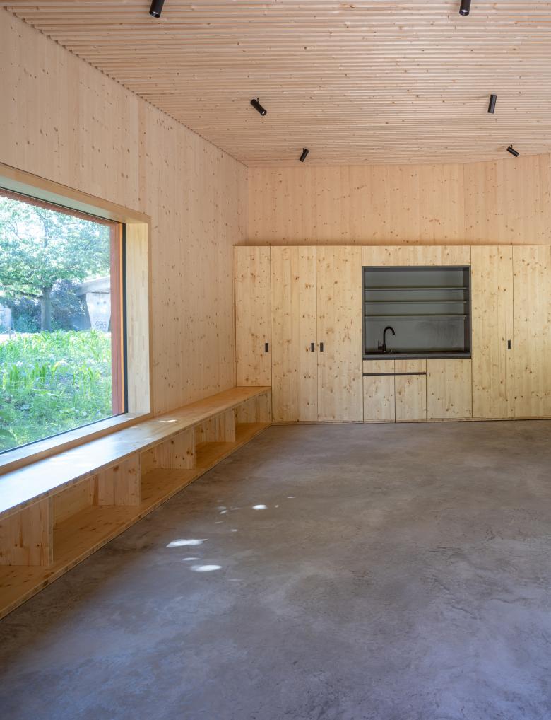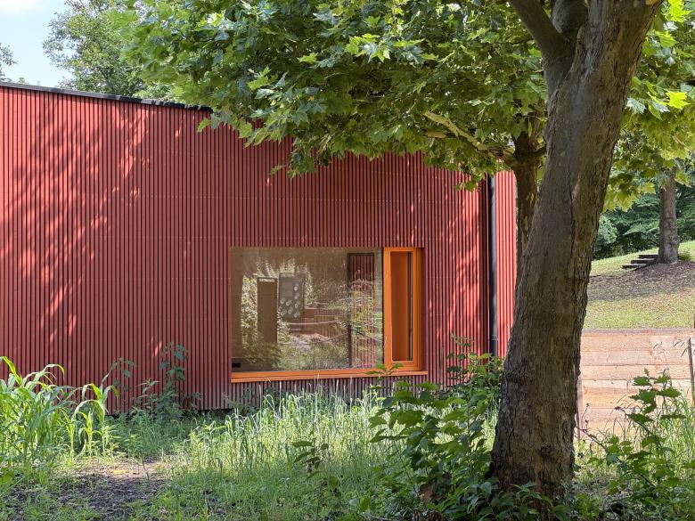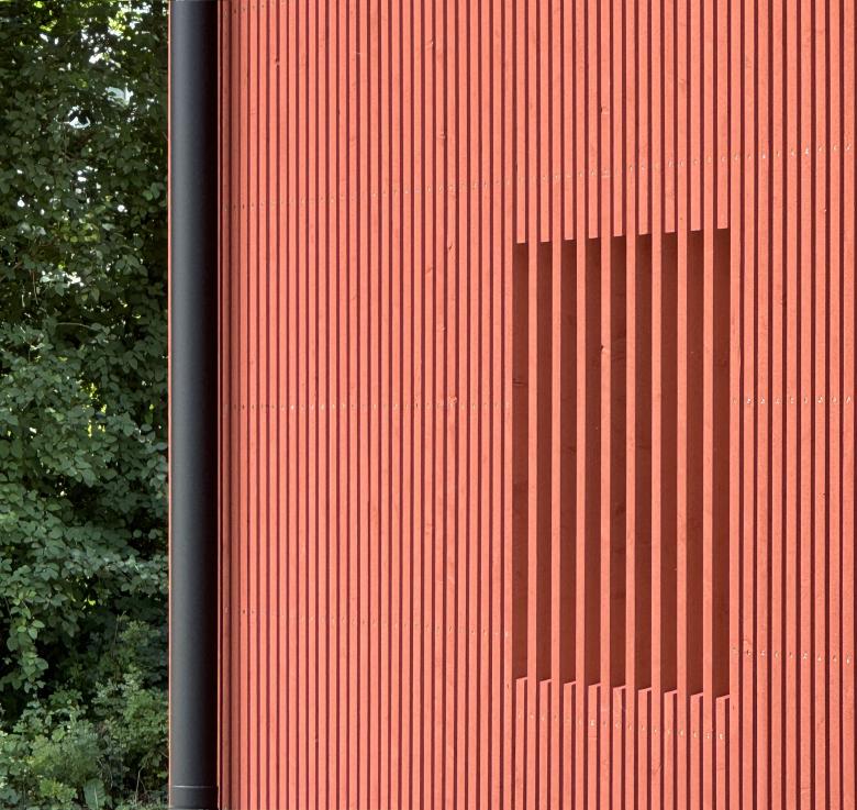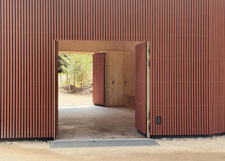 Ein helles Plattenband fasst die beiden Gebäude und die Lärmschutzwand als klar ablesebarer Rahmen, der sich um den Weltacker legt, zusammen und hebt ihn aus seiner Umgebung hervor.