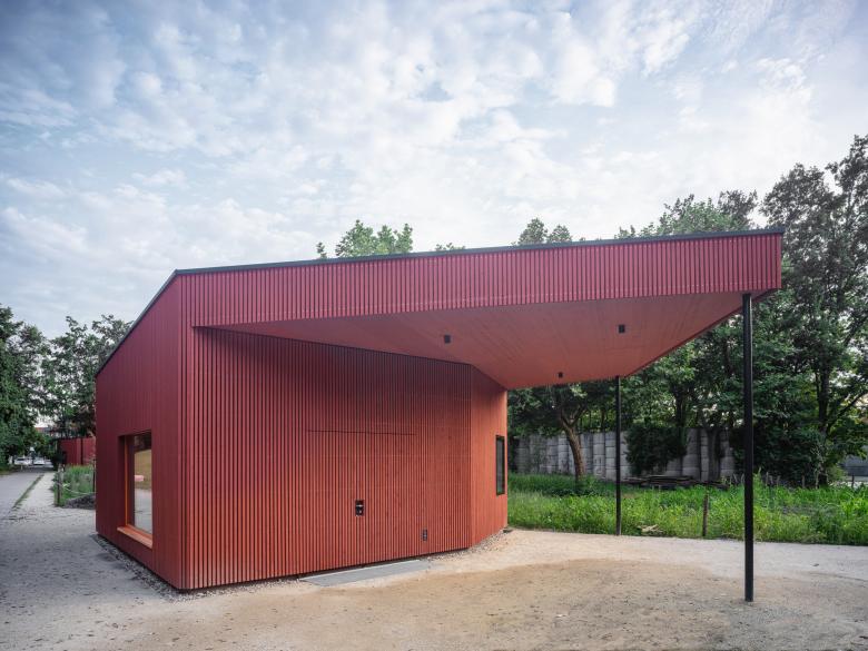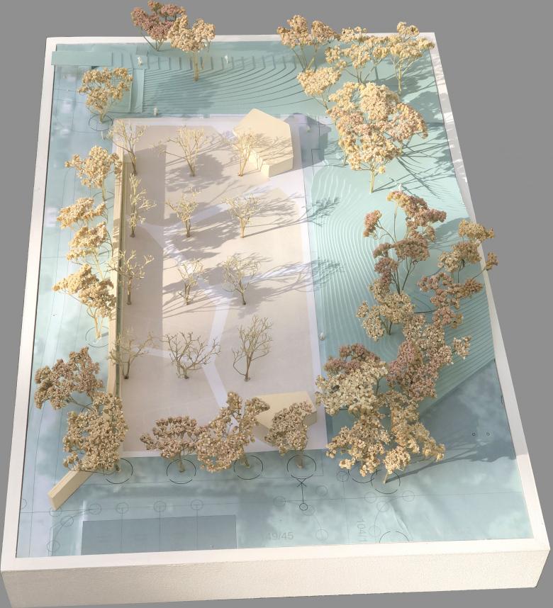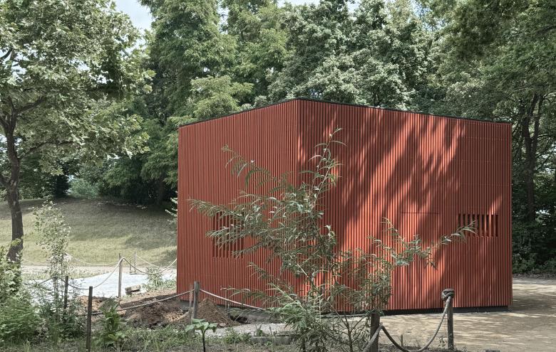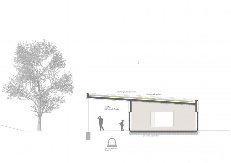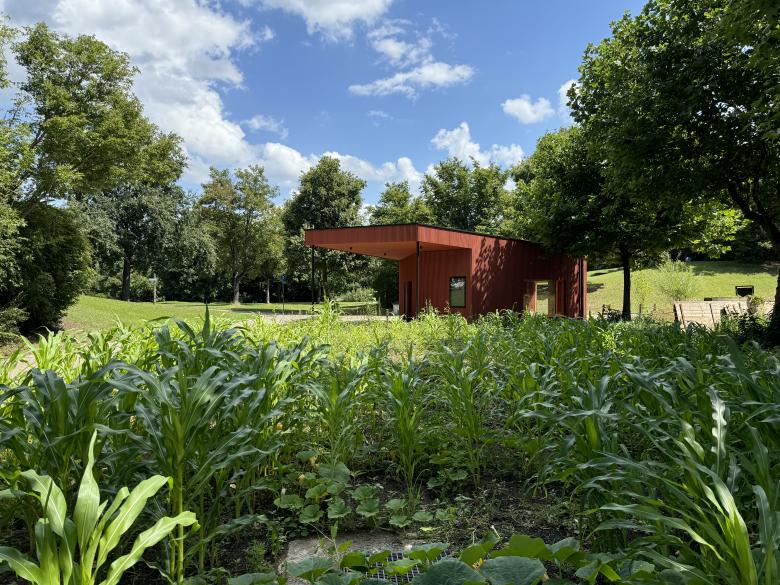 Zwei markante, eingeschossige Gebäude in Holzbauweise, eines zu Ausstellungs- und eines zur Lagerzwecken, definieren zunächst die beiden Eckpunkte des rechteckigen Grundstückes. Zwischen diesen und der Lärmschutzwand spannt sich ein System polygonaler Wege auf, die die bewirtschafteten Felder definieren und zum Spazieren im Weltacker einladen. Die neue polygonale Wegeführung hebt dabei die Wahrnehmung der rasterartigen Parkplatzbepflanzung durch die Platanen auf und lässt Reminiszenzen an einen baumüberstanden Hain aufkommen.