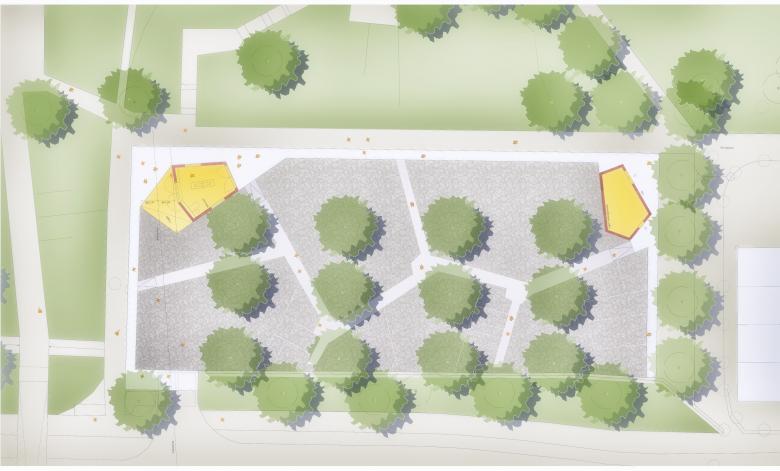 Drei Elemente kennzeichen den Ort des künftigen Weltackers: Platanen in rasterartiger Stellung, locker verteilte, große Bäume des Parks, eine Lärmschutzwand zur Von-der-Tann-Strasse sowie die hügelige Topographie des angrenzenden Westparks.