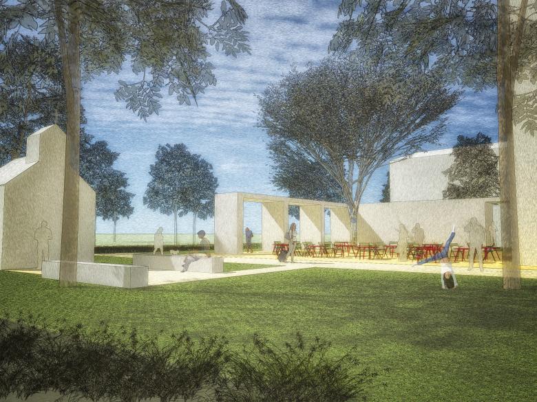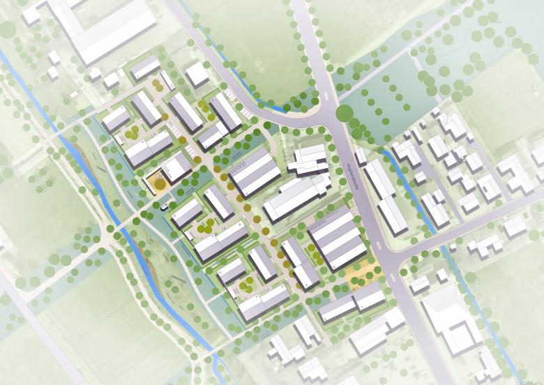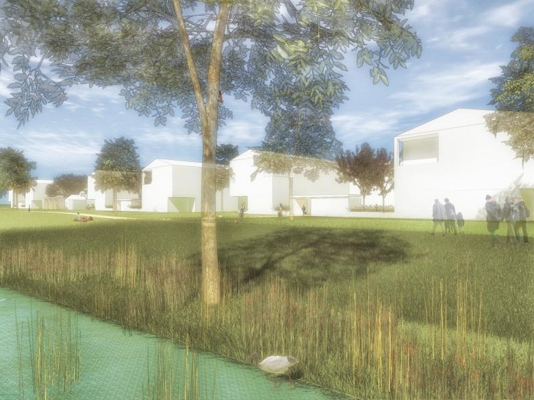 Neues Wohnquartier mit ergänzenden Dienstleistungseinrichtungen, einer Ausflugsgaststätte sowie Quartiersgaragen für die Parkierung.