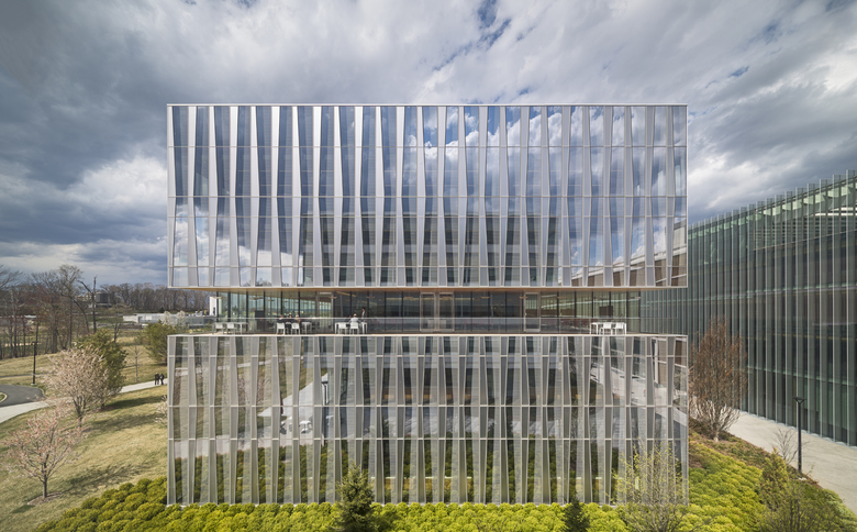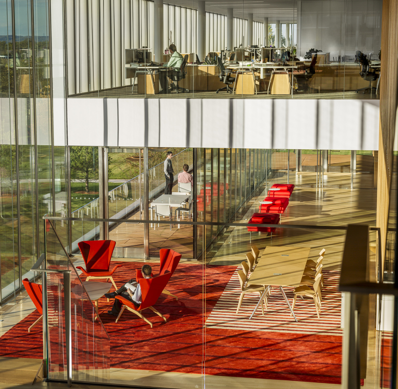 BUILDING 335 is a 140,000 square foot oncology office building at Novartis' North American Headquarters. Five floors of open office work areas are connected by an ascending spiral of "living rooms" with vistas to the generous 230-acre campus. Marked by wood finishes, column free spans, and low iron glass, the "living rooms" provide a common ground for distinct project groups to interact. The primary work areas are light filled and are configured for maximum flexibility and interdisciplinary collaboration. Clad in a curtain wall of oscillating acid etched, reflective, and low iron glass, the building mirrors the landscape and introduces an innovative paradigm for collaborative work. The building is part of Novartis' refreshed North American campus, which also includes buildings by Rafael Viñoly, Fumihiko Maki, and Vittὸrio Lampugnani.