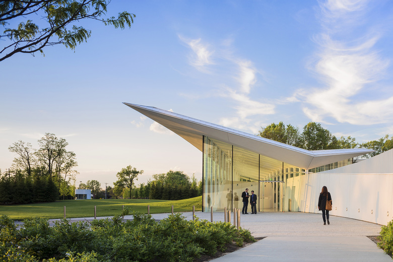 The Visitor Reception Building for Novartis' North American Headquarters presents a dynamic new gateway to the campus. The building emerges from the earth and includes a sequence of reception, orientation, and gathering spaces for the campus. Above, the sculptural roof form with its pleated structural ceiling expresses Novartis' spirit of technological innovation. A solar array canopy at the parking area provides a welcoming introduction to the Novartis Campus and contributes to the building's LEED Gold status.
