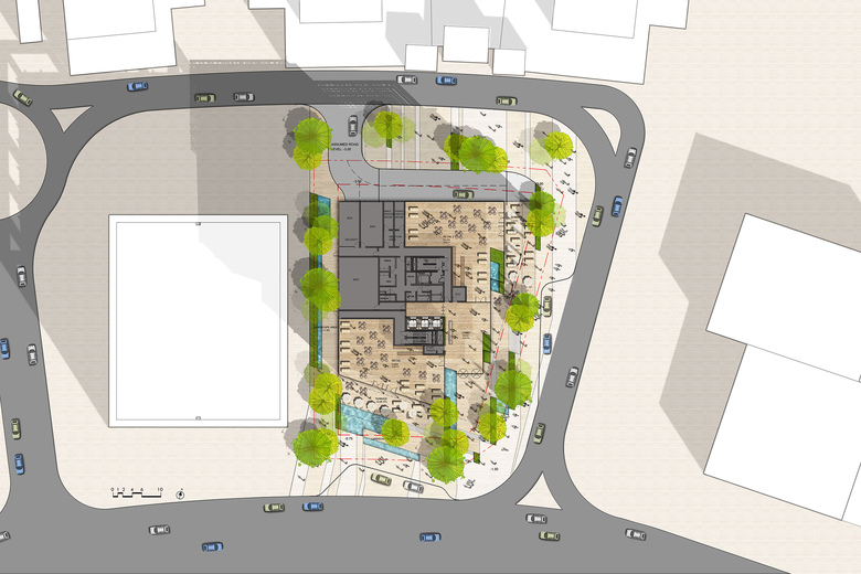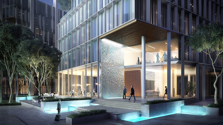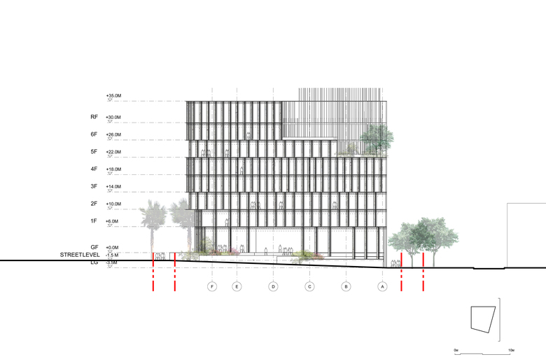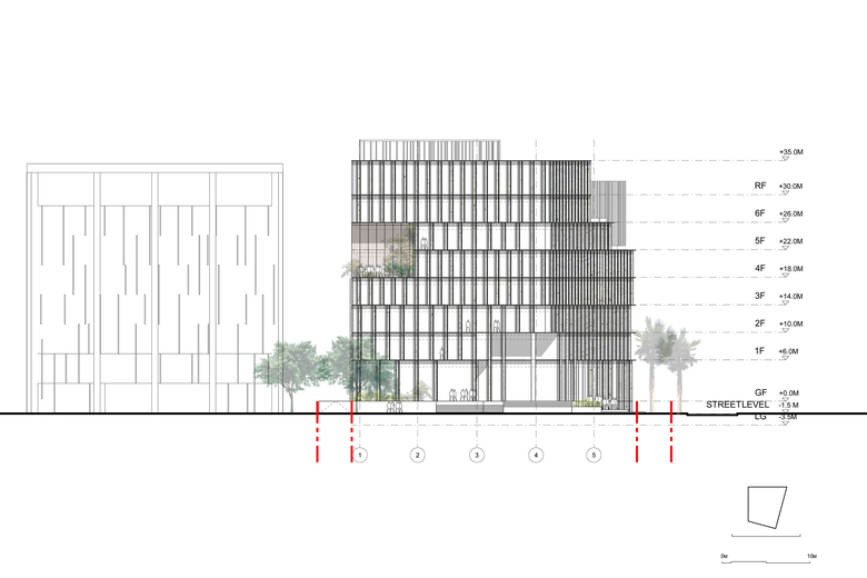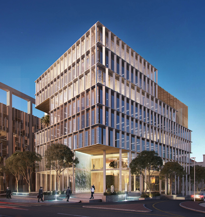 The building entrance is located on the south-east corner providing visibility and identity. Drop offs to the south and east filter into the building stepping and ramping up to the lobby via a series of landscaped terraces. The lobby itself is set back from the building façade above creating a covered and shaded space that is easily accessed from the retail and F&B facilities and the office lobby.