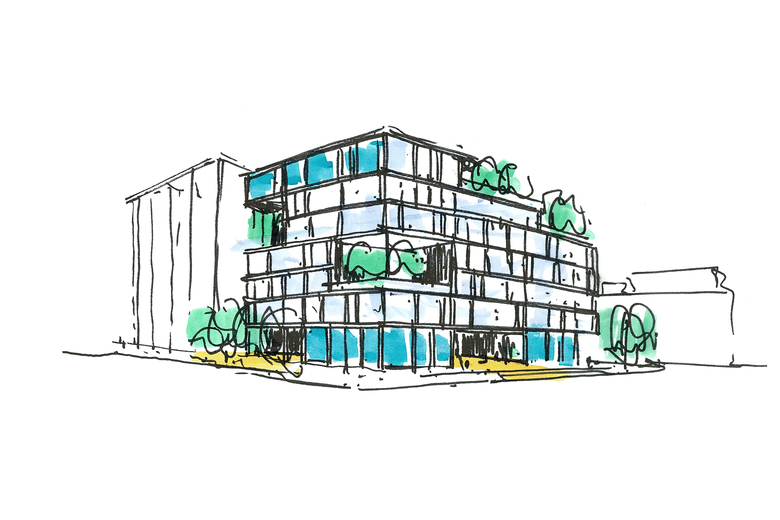 The façade design responds to the solar condition with a series of pre-cast concrete fins wrapping the building. To the south and east, they project out to self-shade the predominantly glazed façade with secondary fritting to the glass. To the north and west façades the fins are flush with the glass providing a more solid appearance and increased privacy. Again secondary fritting to the glass reduces solar glare and overlooking.