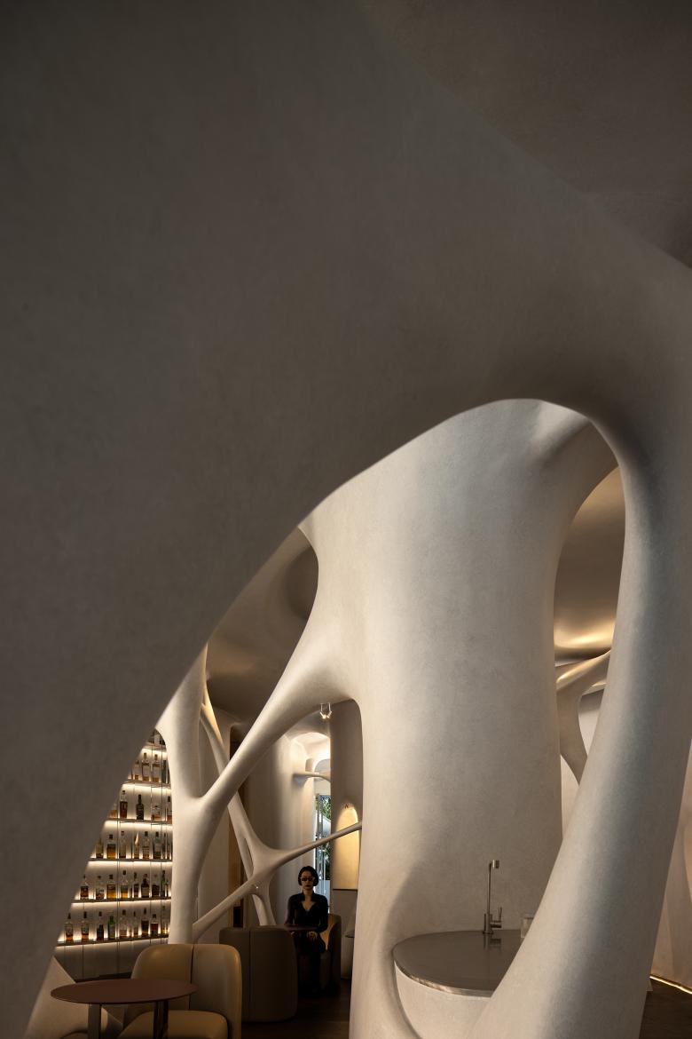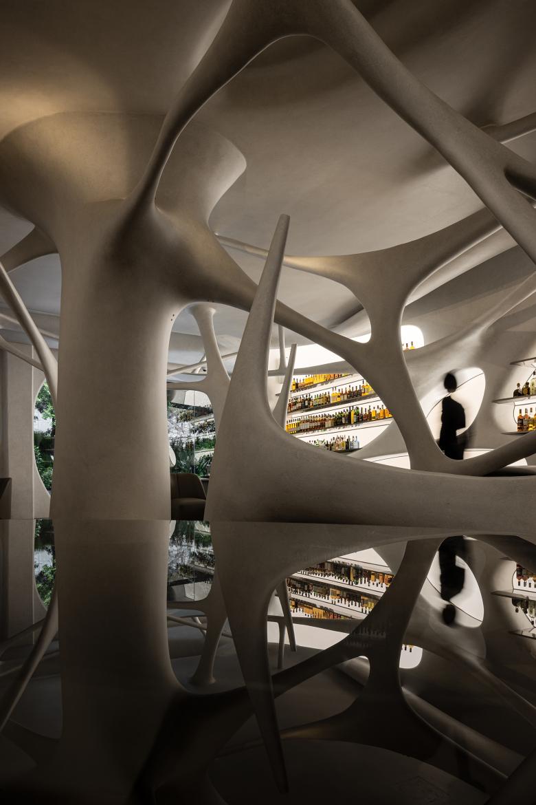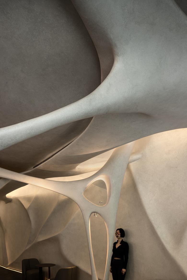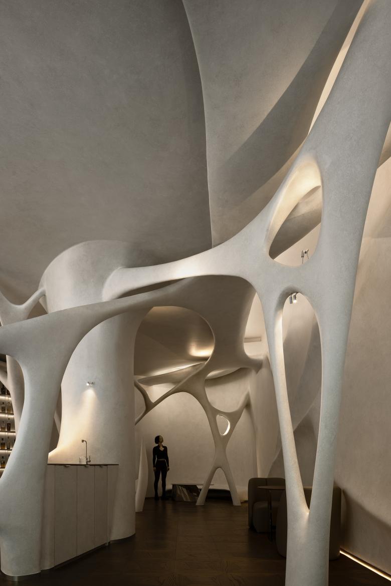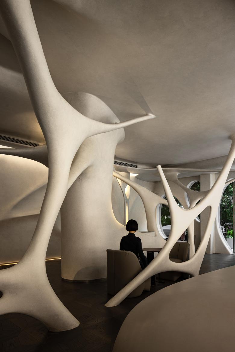 The entire space is internally free and can function in different scenarios. The sense of fluidity of the space creates a dialogue with people and forms a dynamic scene. The form of the space is full of imagination: it can be a cave, a space capsule, or a neuron... It can flexibly switch between the leisure of a cafe during the day and the excitement of a whiskey bar at night.
