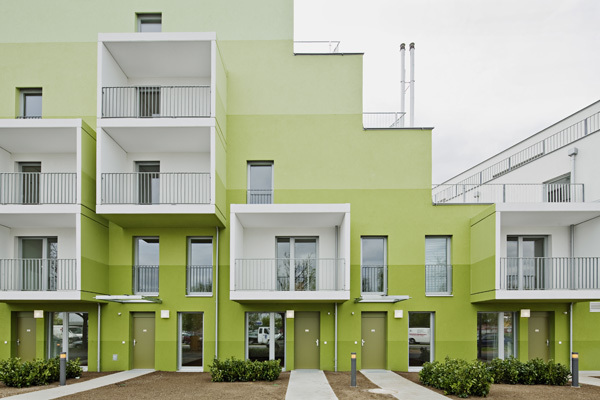 Durchgehendes Gestaltungs- und Qualitätsmerkmal ist die Terrassierung aller Bauteile in den Obergeschossen. Alle Wohnungen haben entweder private vorgelagerte und rückwärtige Gärten, Terrassen, Loggien oder Balkone, teilweise zusätzlich durch gemeinsame Freiflächen am Laubengang ergänzt.