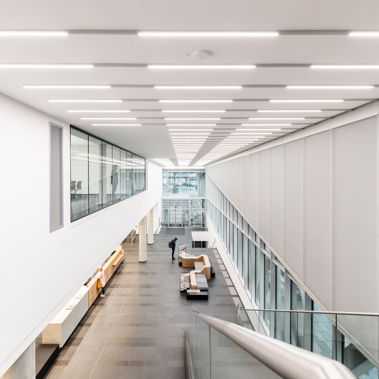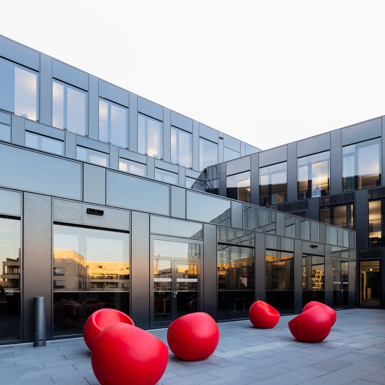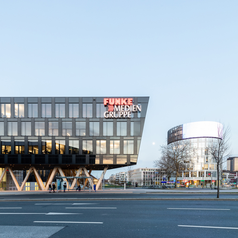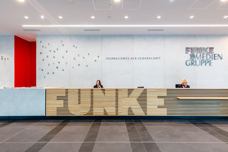 Ein veritables Ausrufezeichen! Das neueröffnete Headquarter der international tätigen Funke Mediengruppe verweist auf ein kohärentes städtebauliches Areal, das sich wie ein wohlproportionierter Körper zu einem großen Ganzen fügt. Sein Kopf: der Funke Medienturm, der überdies die größte Newswall in Deutschland beherbergt. Seine Finger: die umliegenden Baukörper, deren vielfältige Nutzungsmöglichkeiten einen maßgeblichen Faktor in der Planung darstellten. Diesem Ansinnen folgend, umfasst das Ensemble etwa öffentliche Bereiche wie Foyers, Restaurants und Konferenzräumlichkeiten genauso wie Plätze des Verweilens und des Erholens. Im Innenbereich schreibt sich der ausgeprägte Planungsgedanke indes in die unterschiedlichen Nutzflächen ein: Redaktionen treffen auf Büros, eine Kindertagesstätte oder Schulungsräume. Basierend auf den Farben Schwarz, Silber und Weiß spürt das Gestaltungskonzept außerdem dem Prozess des Druckens nach – im übertragenen Sinne manifestiert sich Druckerschwärze hier mittels silberner Stempel auf weißem Papier. Als architektonische Fußnote unterstreichen großflächig verlegte Betonwerksteine im mit Wasserbecken, dicht gepflanzten Baumreihen und hofartigen Grünbereichen durchsetzten Außenbereich obendrein den urbanen Gesamtcharakter der neuen Unternehmenszentrale. Das Funke Media Office – ein zwischen den Essener Stadtteilen Grüne Mitte und Berliner Platz gelegenes Ensemble, das sich im harmonischen Zusammenspiel seiner (Satz-)Teile als weltgewandtes Statement mit Neuigkeitswert lesen lässt.