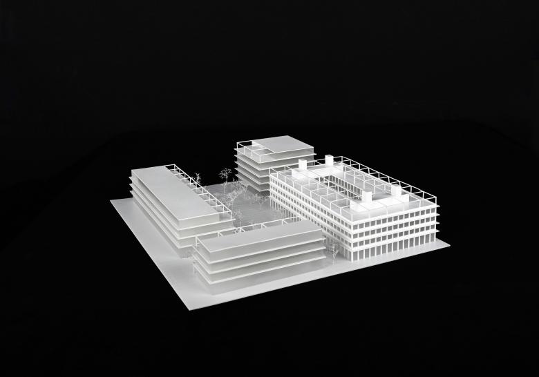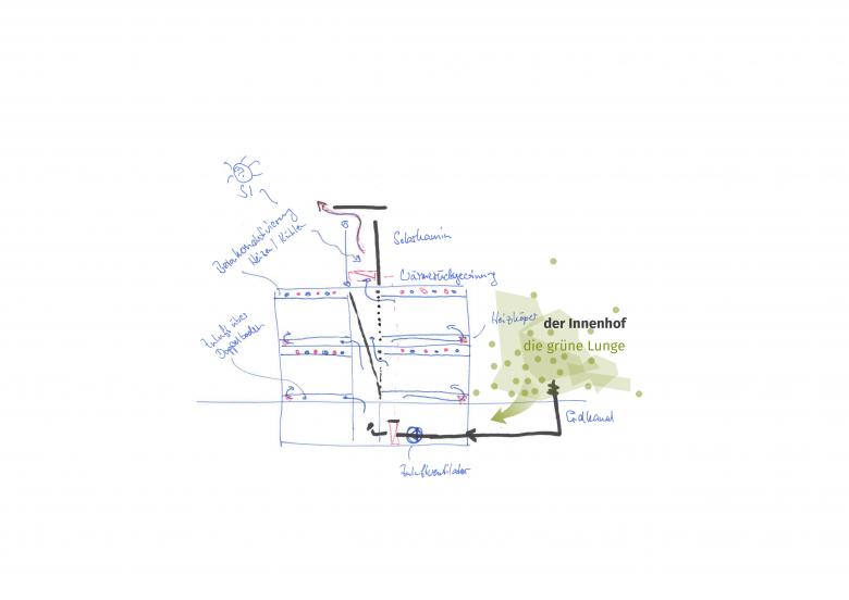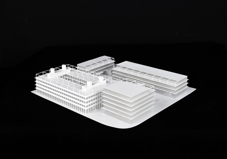 Der Campus besteht aus vier individuellen Baukörpern, die einen zentralen und in alle Richtungen offenen Platz formen. Bäume wechseln sich hier mit Rasenflächen und unversiegelten befestigten Bereichen ab. Angrenzende Parks setzten sich in die Mitte fort und schaffen einen urbanen Ort mit grüner Note, zu dem sich auch alle Gebäudeeingänge orientieren. Auf diese Weise bleiben die direkten Vorbereiche der Bürohäuser frei für einladende Eingangszonen und belebende Gastronomieangebote. Zur Gorxheimer Straße hin präsentiert sich der Stadt eine aus allen Richtungen gut wahrnehmbare moderne Arbeitswelt. Die zulässige Höhe dieses Bauteiles wird nicht ausgenutzt, wodurch ein weitläufiger Dachgarten mit intensiv begrünter Pergola und Photovoltaikanlage entstehen kann.