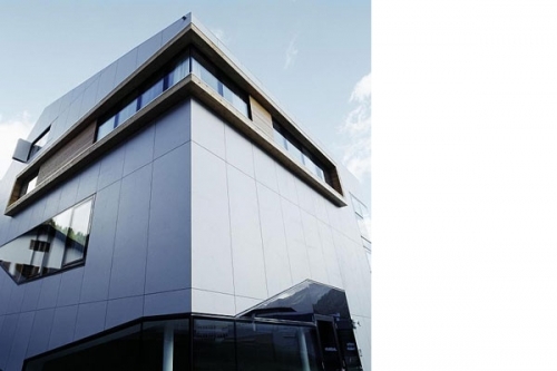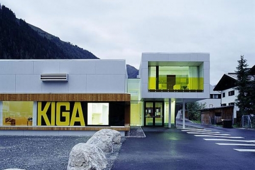 Der Baukörper ist an das Nordeck des Grundstücks gesetzt. An dieser Stelle wird der ansonst ebenerdige Kindergarten zweigeschossig um nahe liegende Bauhöhen aufzunehmen und einen gedeckten, witterungsgeschützten Eingang auszubilden. Hier befindet sich ein Parkplatz, der aber vor allem auch Vorhofcharakter bekommen soll, sich durch das Foyer durchzieht und als befestigter und überdachter Spielplatz in den Garten hineinragt. Vom Foyer ausgehend zieht sich die Hauptachse quer durch das ganze Gebäude. An dieser Achse sind sowohl Gruppenräume sowie Gemeinschaftsräume aufgefädelt. Diese Achse ist sowohl Verbindungsweg wie auch Garderobe, zudem wird sie durch die angrenzenden Aufenthaltsräume belebt und bewohnt, die flexibel geöffnet oder abgeschlossen werden können. Die Gruppenräume sind gleichwertig gegen Südosten ausgerichtet und liegen mit ihren riesigen Aussichtsfenstern praktisch bereits im Garten. Die zwei eingeschnittenen Gärten umfließen einerseits die Gruppenräume, andererseits verbinden sie aber auch den Südwest orientierten Bewegungsraum mit dem großen Vorgarten im Südosten. Der Bewegungsraum geht nahtlos in den Außenraum über. Über Stufen, die gleichzeitig als Tribüne für kleine Aufführungen genützt werden können, gelangt man zum „Tantenhaus“. Von dort aus kann sowohl der Eingangsbereich als auch der Bewegungsraum überblickt und beaufsichtigt werden.