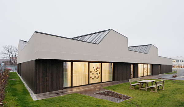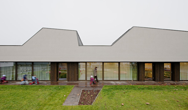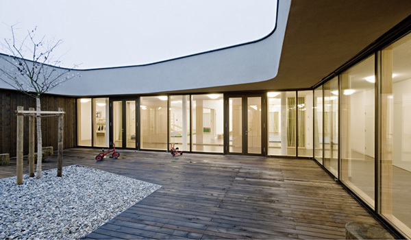 Ein Flachbau von 30x40m mit einem zentralen Innenhof. Der Rundgang um den Hof erschließt alle Räume und ist so überdimensioniert, dass er nicht nur Gang, sondern gemeinschaftlicher Spielbereich für alle Kindergartengruppen wird – für Bobby Cars gilt Rechtsverkehr! Der Innenhof ist eine Erweiterung der angrenzenden Bewegungsräume – ein Cabrio-Raum – immer offen.