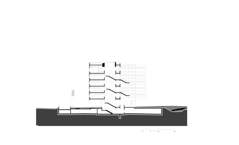 Der räumliche Erlebniswert dieser Erschließungszone mit seinen Ein-, Aus- und Durchblicken ist von hoher räumlicher Qualität und stellt die Besonderheit des Entwurfes dar. Kommunikation, interner Austausch und das Miteinander werden in den Vordergrund gestellt, gleichzeitig ist Konzentration und ruhiges Arbeiten möglich.