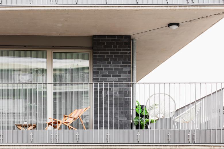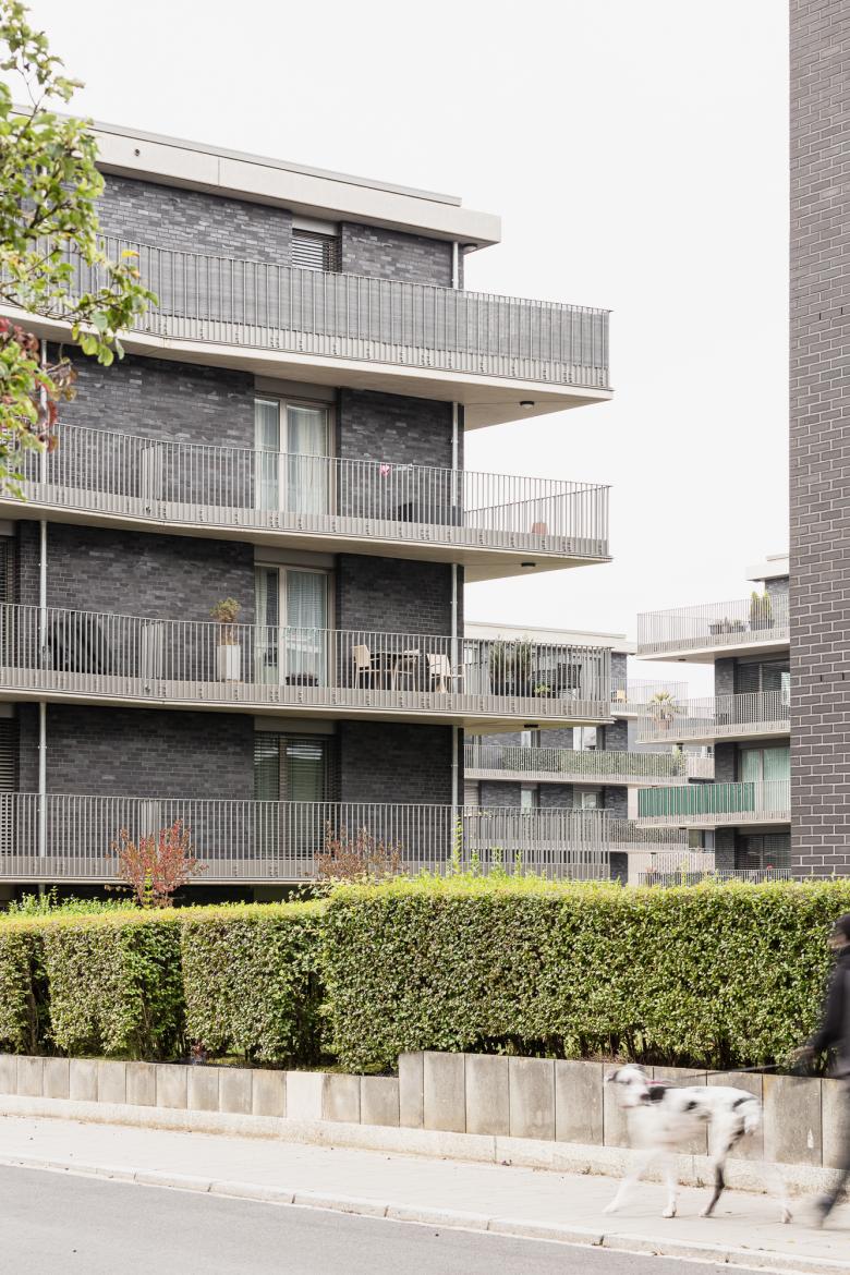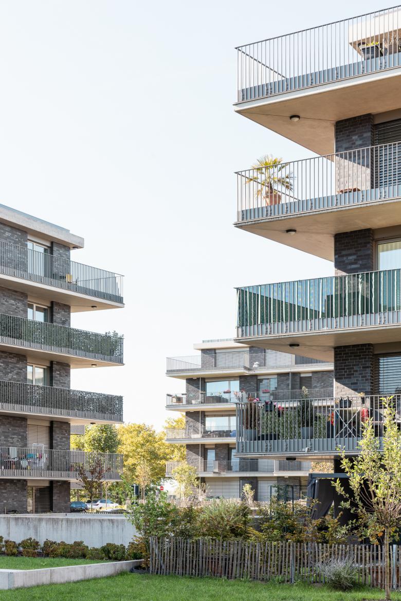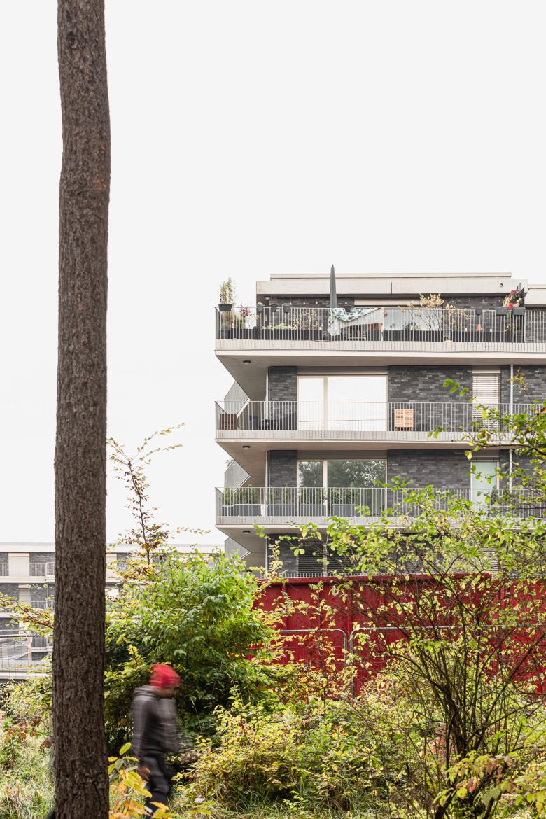 Vater, Mutter, Kind. Wie eine prototypische Familie fügen sich im Luxemburgischen Kirchberg zwei große und zwei kleine Baukörper zu einem neuen Ensemble, das insgesamt 94 Wohnungen Platz bietet. Die langgestreckten Baukörper im Quartier du Parc Réimerwee liegen am nordöstlichen Rand eines Neubaugebietes, die nordwestliche Seite wird vom Boulevard Konrad Adenauer gesäumt. Nach Süden hin öffnet sich die Anlage zum Parc Réimerwee. Zwei punktförmige Bauten vervollständigen das Ensemble und lassen so ein aus vier Individuen zusammengesetztes architektonisches Kollektiv entstehen. Die Differenzierung der Baukörper verhilft dem Gesamtkomplex im Quartier du Parc Réimerwee – wie in einer aus unterschiedlichen Charakteren bestehenden Familie – zu einer heterogenen, vielfältigen Erscheinung. Im straßenseitigen Riegel sind sämtliche Wohnungen zum Park hin orientiert und verfügen allesamt über einen Balkon oder eine Terrasse. In den parkseitigen Häusern sind die Apartments zu allen Seiten geöffnet, somit entstehen Wohneinheiten höchst unterschiedlichen Zuschnitts. Das verbindende Treppenhaus weitet sich zu einem Gemeinschaftsraum mit Terrasse. Die Fassaden der Gebäudeteile sind horizontal gegliedert, wobei sich das Band auf Höhe der Wohnräume zu geräumigen Balkonen verbreitert. Umlaufende Geländer verstärken die dynamische Wirkung der in den harmonischen Familienverband eingebetteten Baukörper.