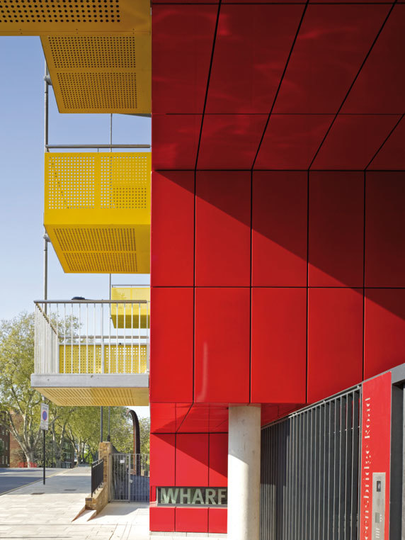Each flat has a balcony supported from beams at roof level, cantilevering like lifting beams on warehouses. Each balcony is clad with a coloured plane with a single fold in it, and offset from the windows, cantilevering in alternate directions at each floor to produce double height gaps between them and reduce overshadowing to the living rooms below. The colours on the planes of the balconies are then graduated across the façade, which are seen to best advantage obliquely down the street.The courtyard at the heart of the scheme is a shared garden for use by the residents, the landscaping providing a focus when viewed from above and from the street. Simple use of geometric lines relating to the façades, circulation and lines of movement through the site create a variety of smaller spaces for the use of different groups of people for resting or playing in the space simultaneously. These are formed by lines of hedges and trees delineating different simple surface finishes.