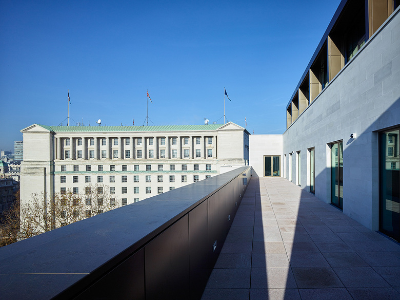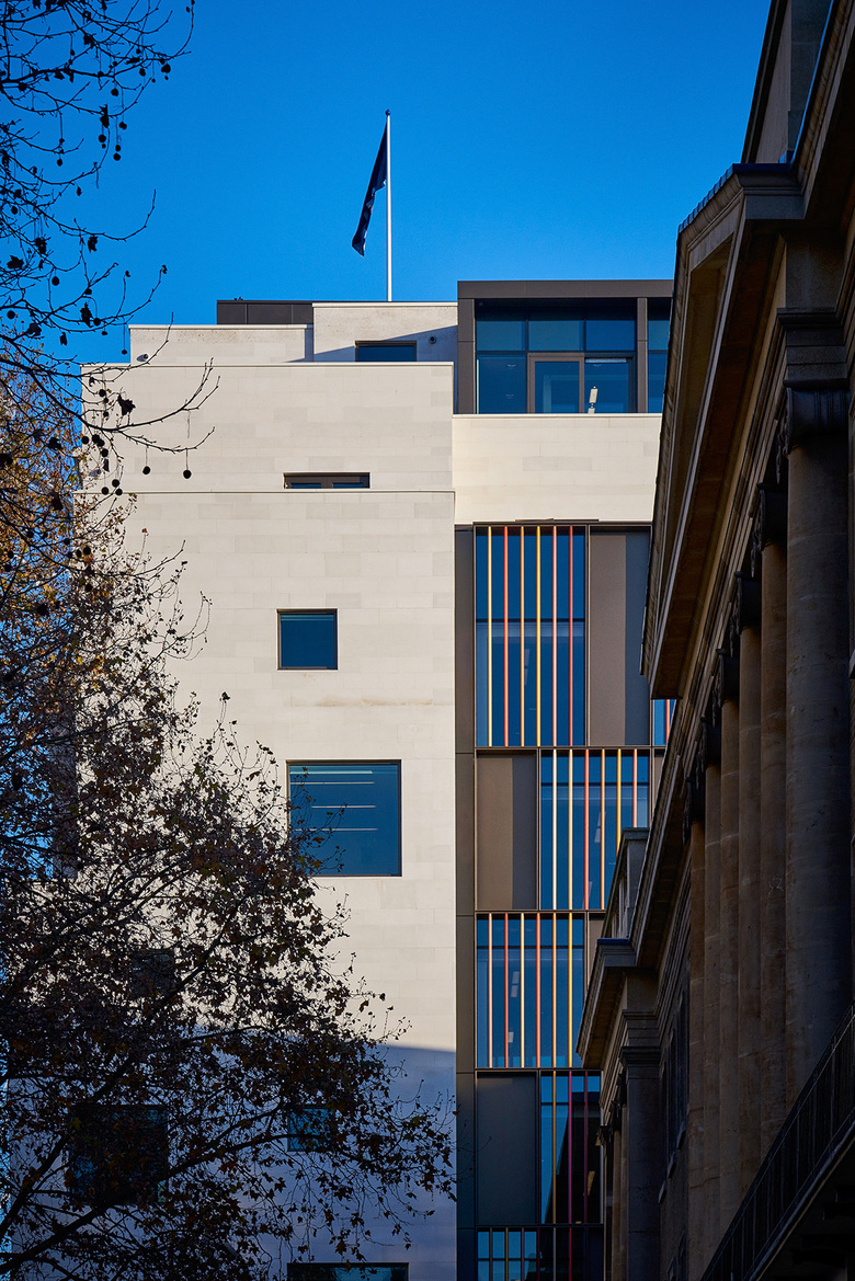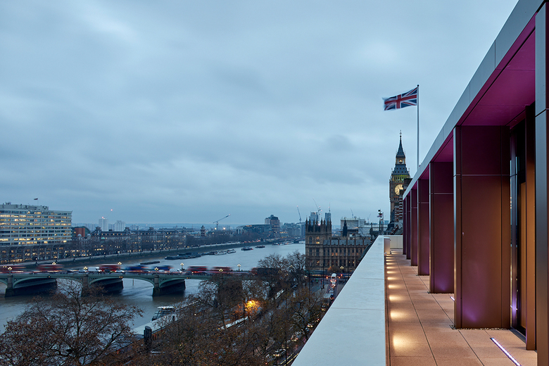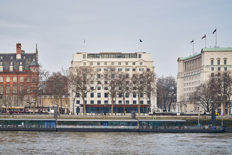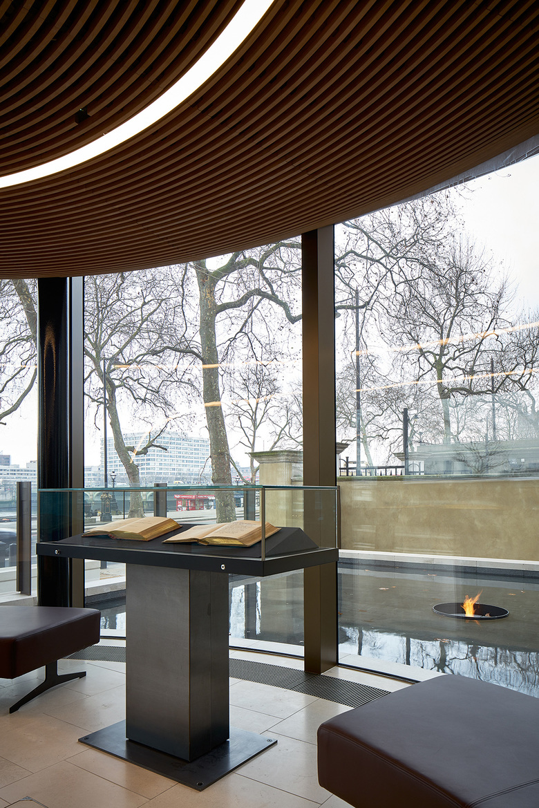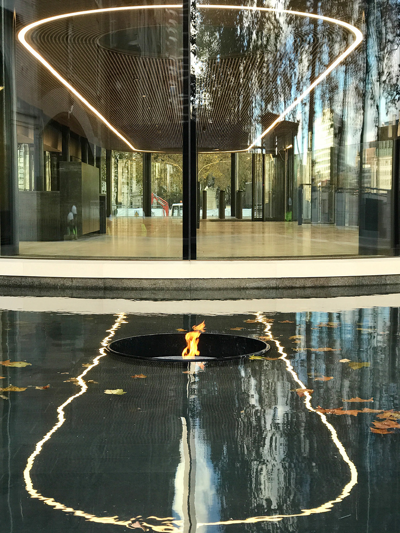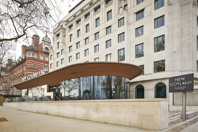 AHMM’s design for New Scotland Yard is a radical remodelling and extension of the Curtis Green Building, a 1930s building on the Thames Embankment, which was an earlier home of the MPS. The core objectives of the brief were to create modern, flexible and efficient office environments, extend available floor space and facilitate agile working with more interaction between staff. The design has transformed the building with the addition of an elegant curved glass entrance pavilion and rooftop pavilions and a reworking of the existing accommodation. The scheme has expanded the building’s floor area from 8,691sqm to around 12,000sqm through extensions to the rear, roof and front concourse. The contemporary design of these complements and enhances the architectural features of the original building and the materials, colours and proportions of neighbouring Whitehall buildings. Inside the building, AHMM has created a flexible office environment to facilitate collaboration and interaction. The rooftop extension provides multi-use conference space and terraces, and is illuminated to give presence at night, symbolising the 24/7 nature of the building along with its civic purpose. A brick ‘carpet’ in the landscape outside the entrance references the distinctive striped brickwork of the neighbouring Norman Shaw North building, while the Eternal Flame has been set within a contemplation pool south of the entrance pavilion.