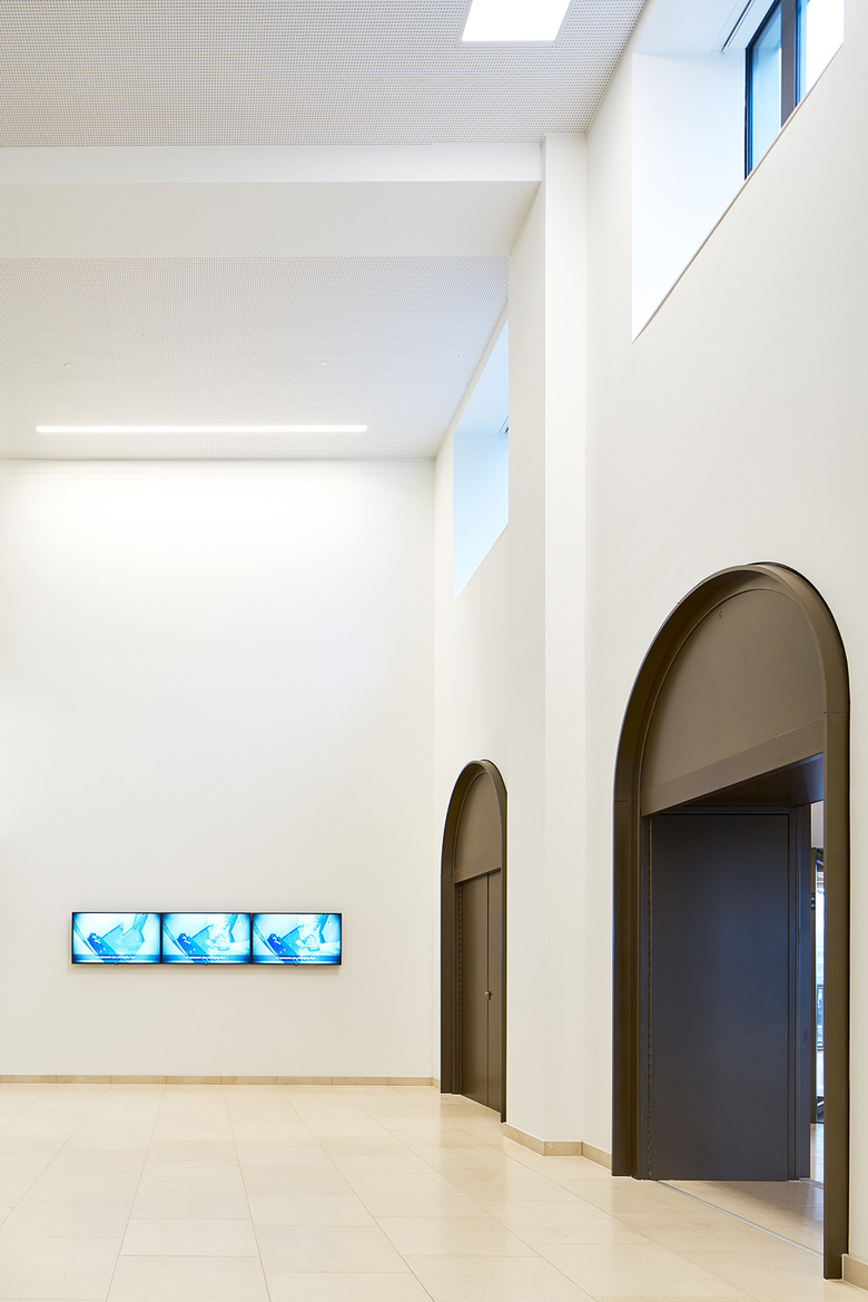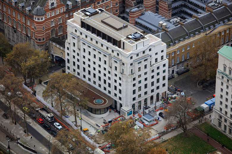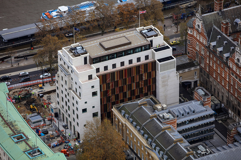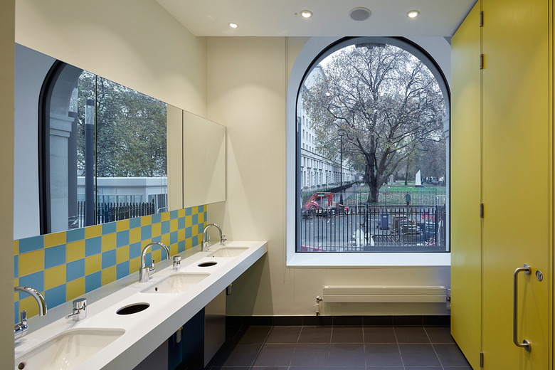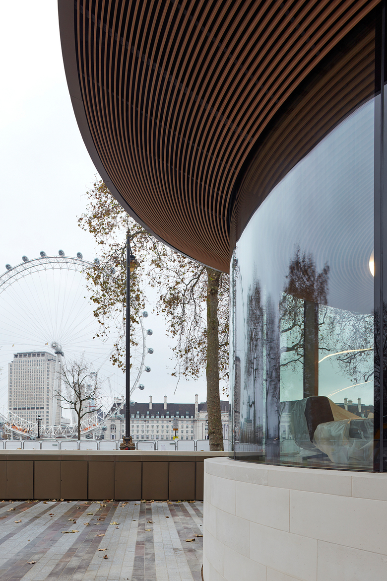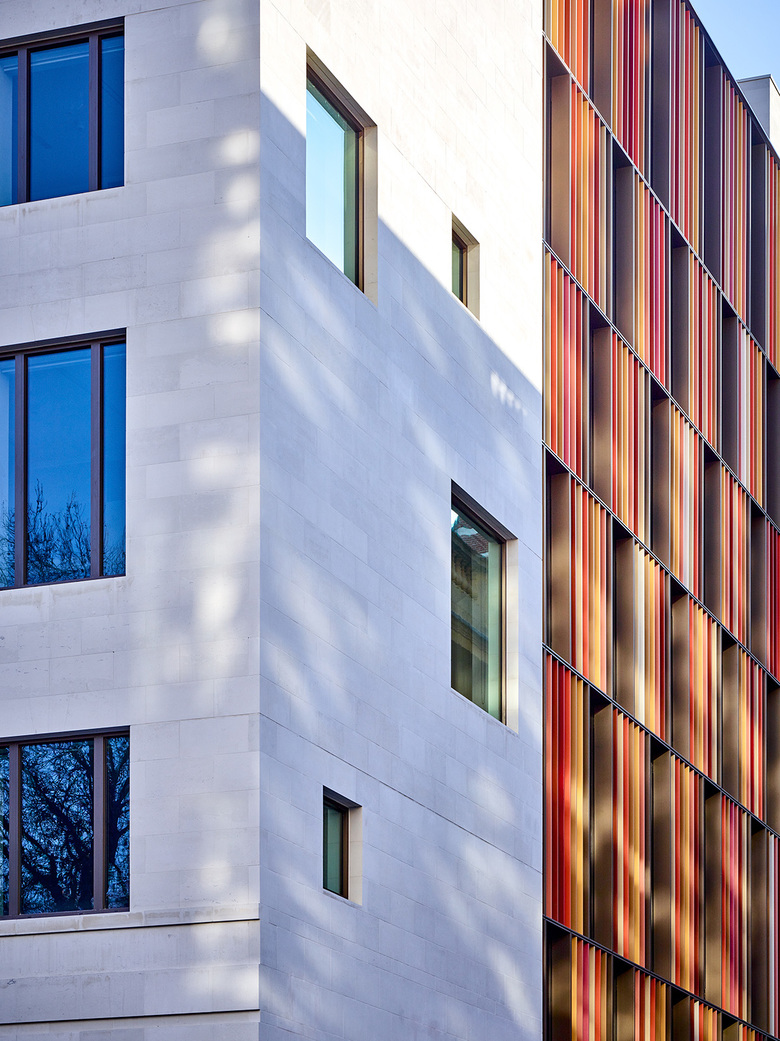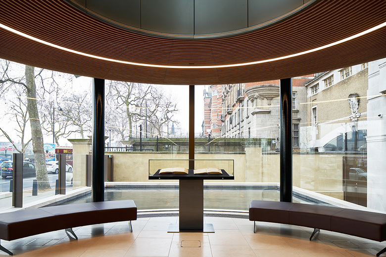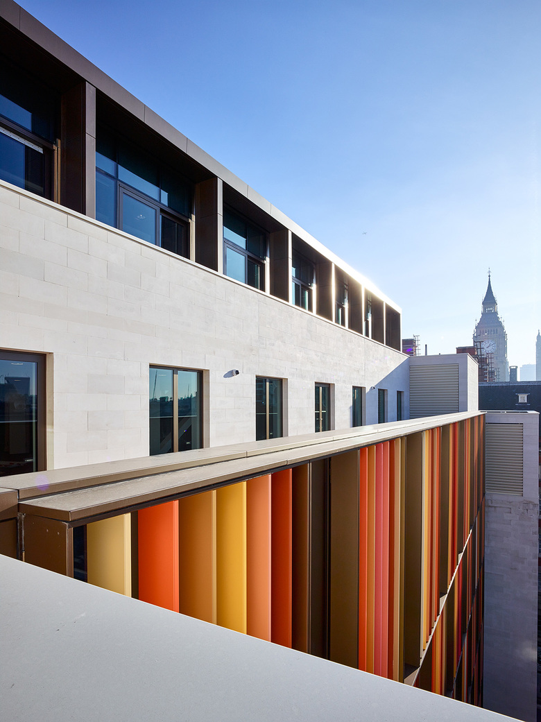 AHMM’s design for New Scotland Yard is a radical remodelling and extension of the Curtis Green Building, a 1930s building on the Thames Embankment, which was an earlier home of the MPS. The core objectives of the brief were to create modern, flexible and efficient office environments, extend available floor space and facilitate agile working with more interaction between staff. The design has transformed the building with the addition of an elegant curved glass entrance pavilion and rooftop pavilions and a reworking of the existing accommodation. The scheme has expanded the building’s floor area from 8,691sqm to around 12,000sqm through extensions to the rear, roof and front concourse. The contemporary design of these complements and enhances the architectural features of the original building and the materials, colours and proportions of neighbouring Whitehall buildings. Inside the building, AHMM has created a flexible office environment to facilitate collaboration and interaction. The rooftop extension provides multi-use conference space and terraces, and is illuminated to give presence at night, symbolising the 24/7 nature of the building along with its civic purpose. A brick ‘carpet’ in the landscape outside the entrance references the distinctive striped brickwork of the neighbouring Norman Shaw North building, while the Eternal Flame has been set within a contemplation pool south of the entrance pavilion.