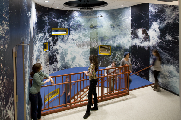 Students submerge into the waves, moving down and around to their next class. Representing the next wave for science education, the Interactive Forum immerses high school students of The Latin School in an opportunity and technology rich center, synthesizing analytical and aesthetic investigation and learning.