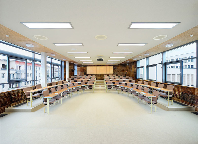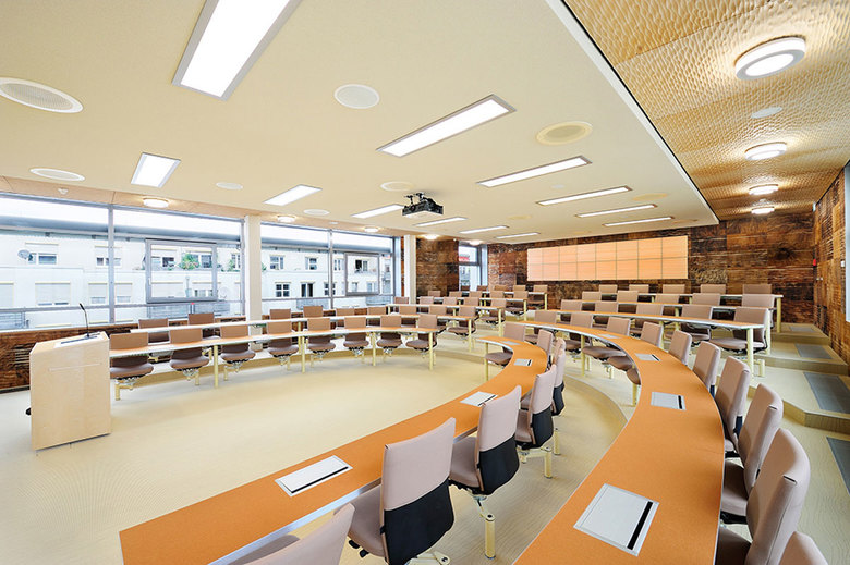 Konzept Seminarraum – In den beiden Seminarräumen entsteht durch das ansteigende Gestühl eine Diskussionsatmosphäre, in der alle Teilnehmer gut miteinander kommunizieren können.