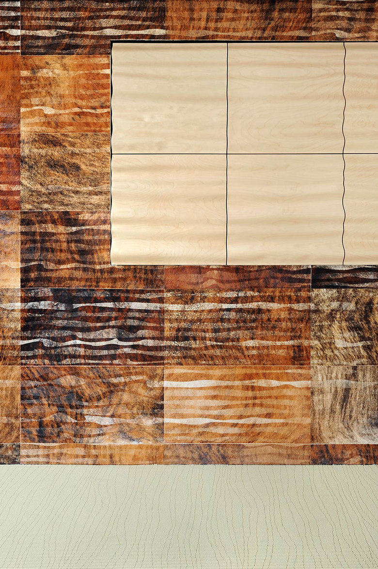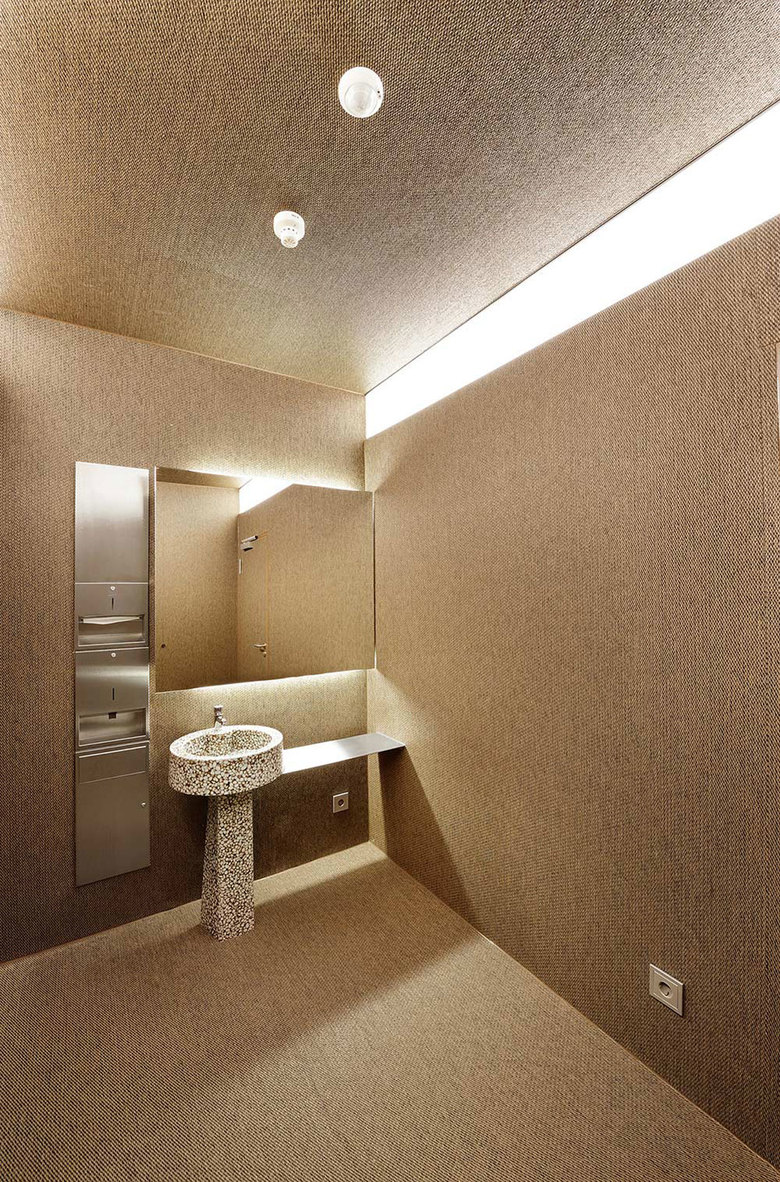 Gestaltung – Die Welle zieht sich gestalterisch über Boden-, Wand- und Deckenmaterialien. hinterleuchtetes Sperrholz, wellenförmig auf Holzrahmen gespannt an der Rückwand des Saales; gelaserte patagonische Rinderfelle an den Wänden; wellengefräste Holzwerkstofftafeln an den Decken. Das Gesamtambiente ist in Erd- und Naturtönen gehalten. Die sanitären Anlagen sind in ähnlicher Farbigkeit mit einem Vinyl-Material durchgängig an Boden, Wänden und Decken belegt.