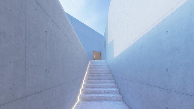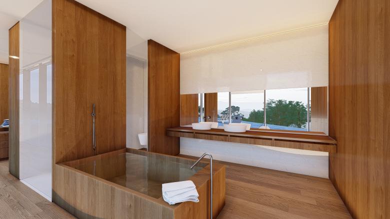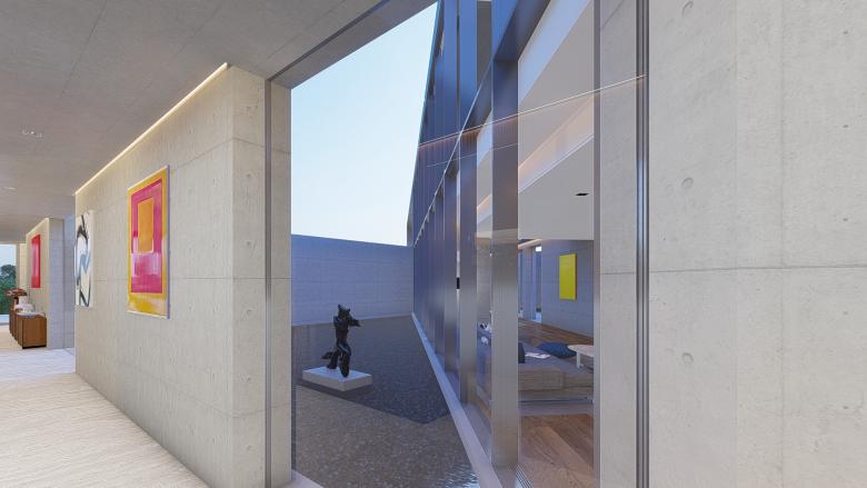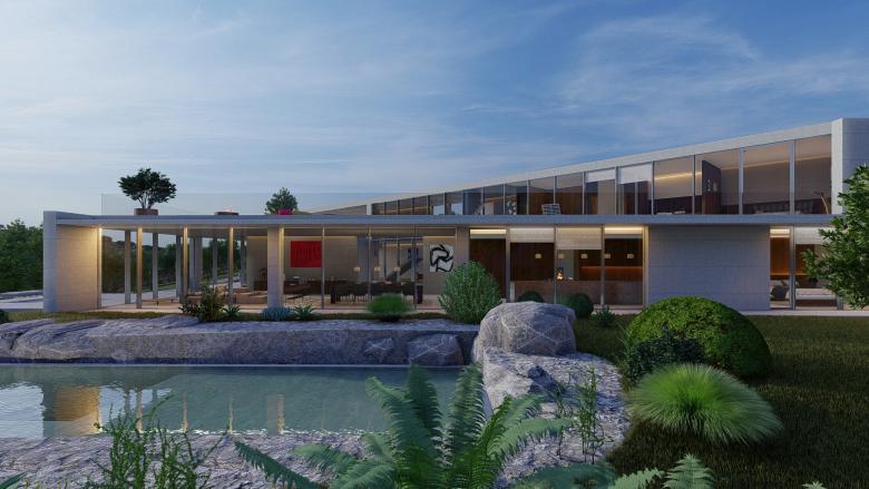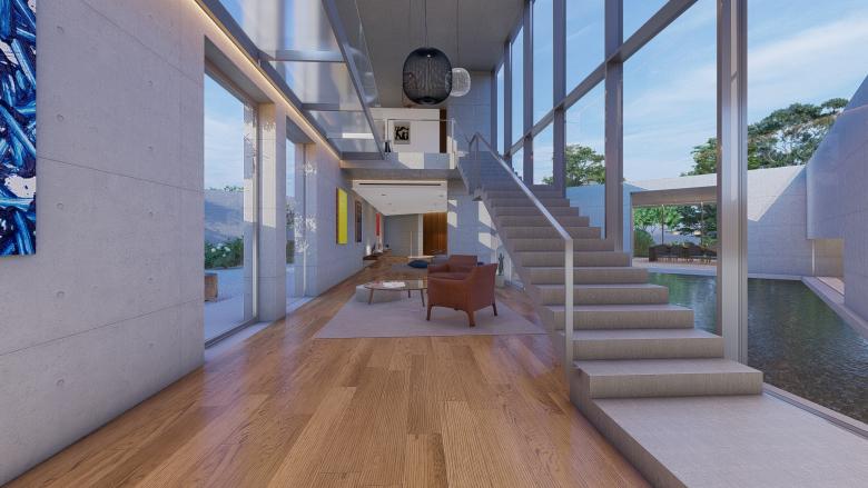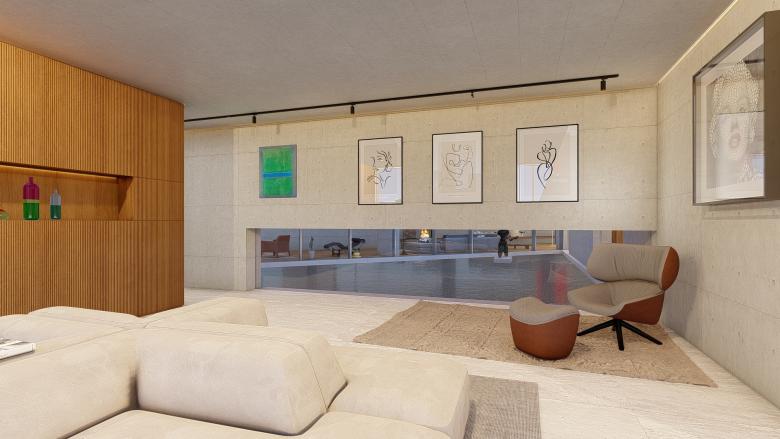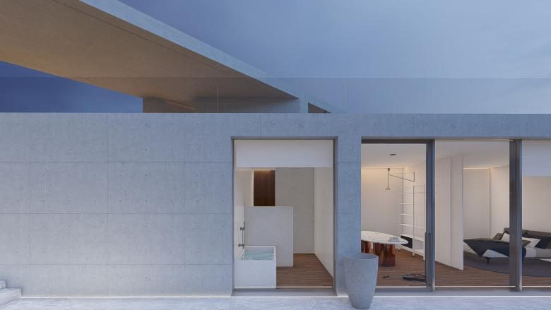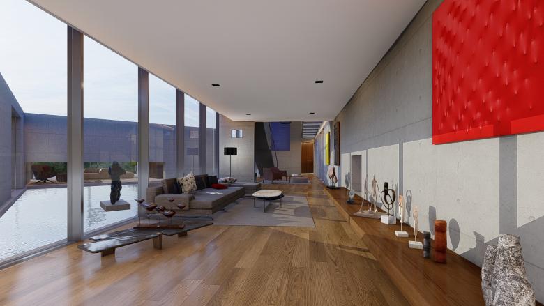 Lo spazio privato su due livelli oltre ad affacciarsi a sud ovest con la corte d'acqua si affaccia a nord est con un giardino "zen"; uno spazio pieno di silenzio ove la famiglia può trascorrere i momenti più intimi. All'estro oltre ad un terrazzo voluto appositamente a sud che permetta la vista non solo dei tramonti ma di Roma la "città eterna"; una piscina si aggetta rendendosi sospesa sul vuoto, crea una vasca d'acqua pronta a raccogliere i tramonti.