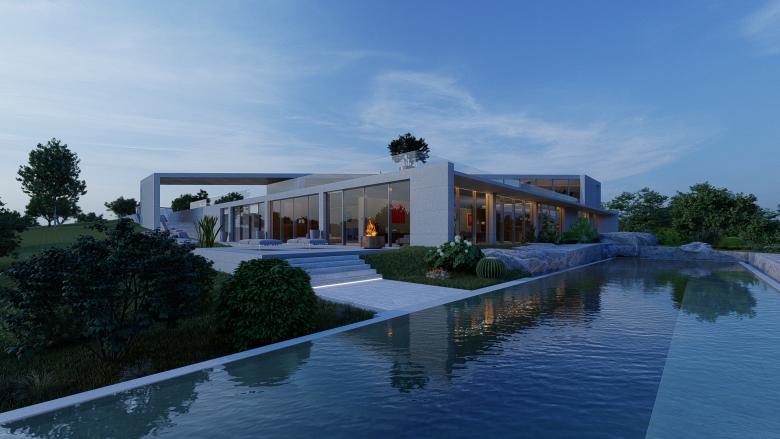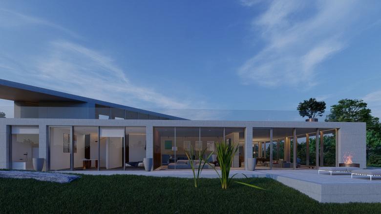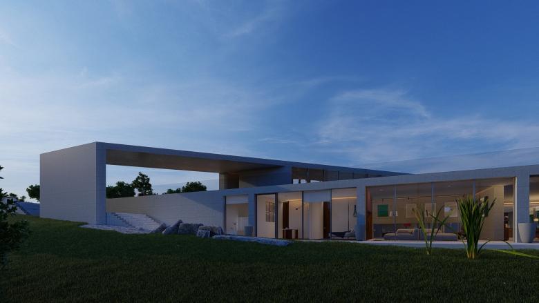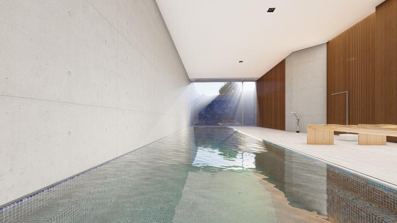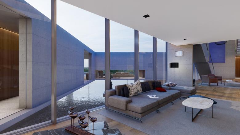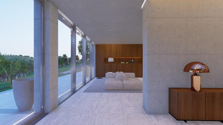 Abbiamo pensato di realizzare la villa all'interno di un triangolo dove il fronte a sud ruotato di 45° si apriva verso sud ovest; quì una corte d'acqua rispecchia il cielo e i tramonti. In questa corte, spazio interstiziale, si affaccia il cuore della casa, i suoi saloni e lo studio, voluto dal cliente.