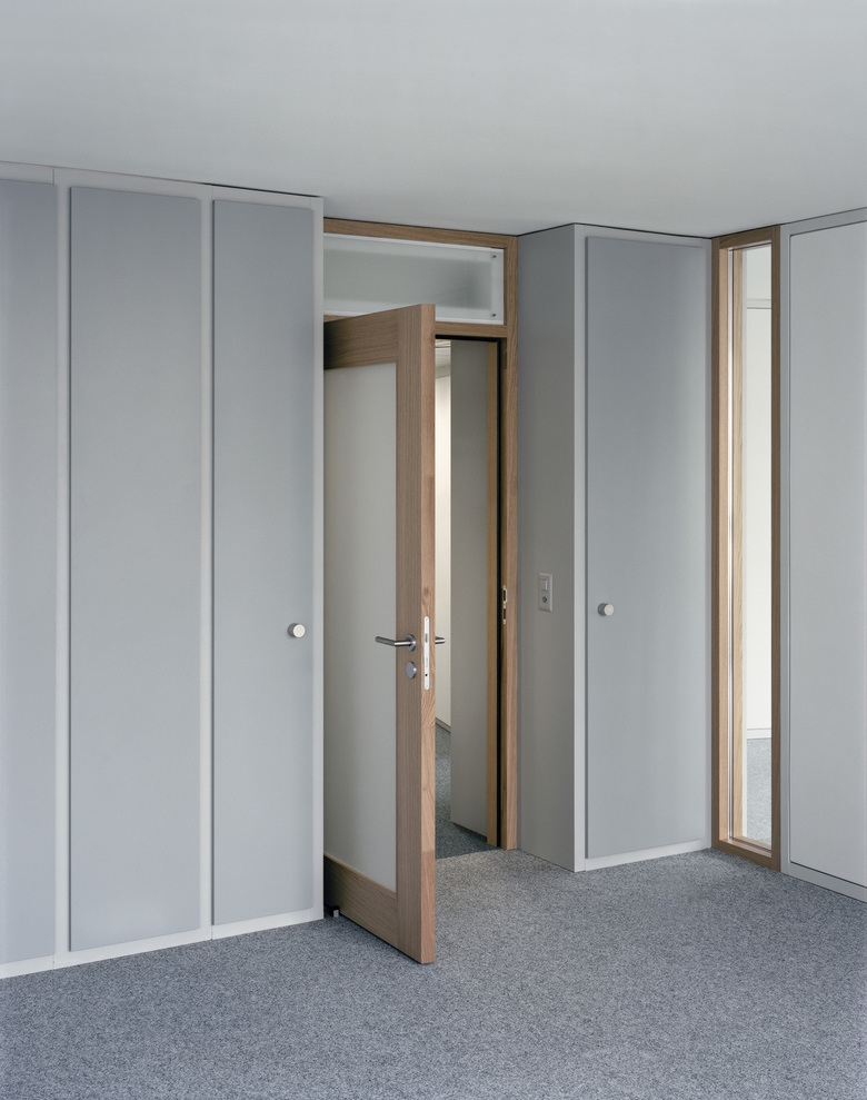 Um den Eindruck einer grosszügigen Bürofläche und dennoch die Diskretion eines Einzelbüros zu erhalten, wurden alle raumtrennenden Bauteile wie Möbel behandelt und von den raumdefinierenden Flächen abgerückt. Ein schlankes, hochformatiges Fenster-element trennt die freigestellten Wandscheiben und Schrankfronten von den Fenstern der Fassade sowie von der Wand des Treppenhauskerns. Die Durchlässigkeit der Fenster und Türen wird umrahmt vom warmen Eichenholz. Sie setzten so einen Akzent in Farbe und Material. Alle anderen Flächen werden in eine Symphonie aus Grau-Nuancen getaucht.