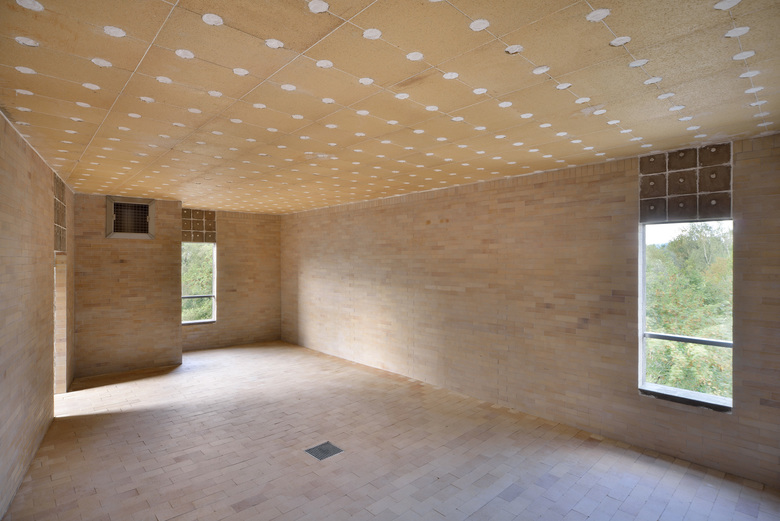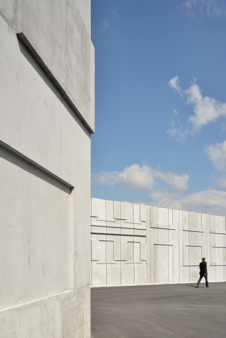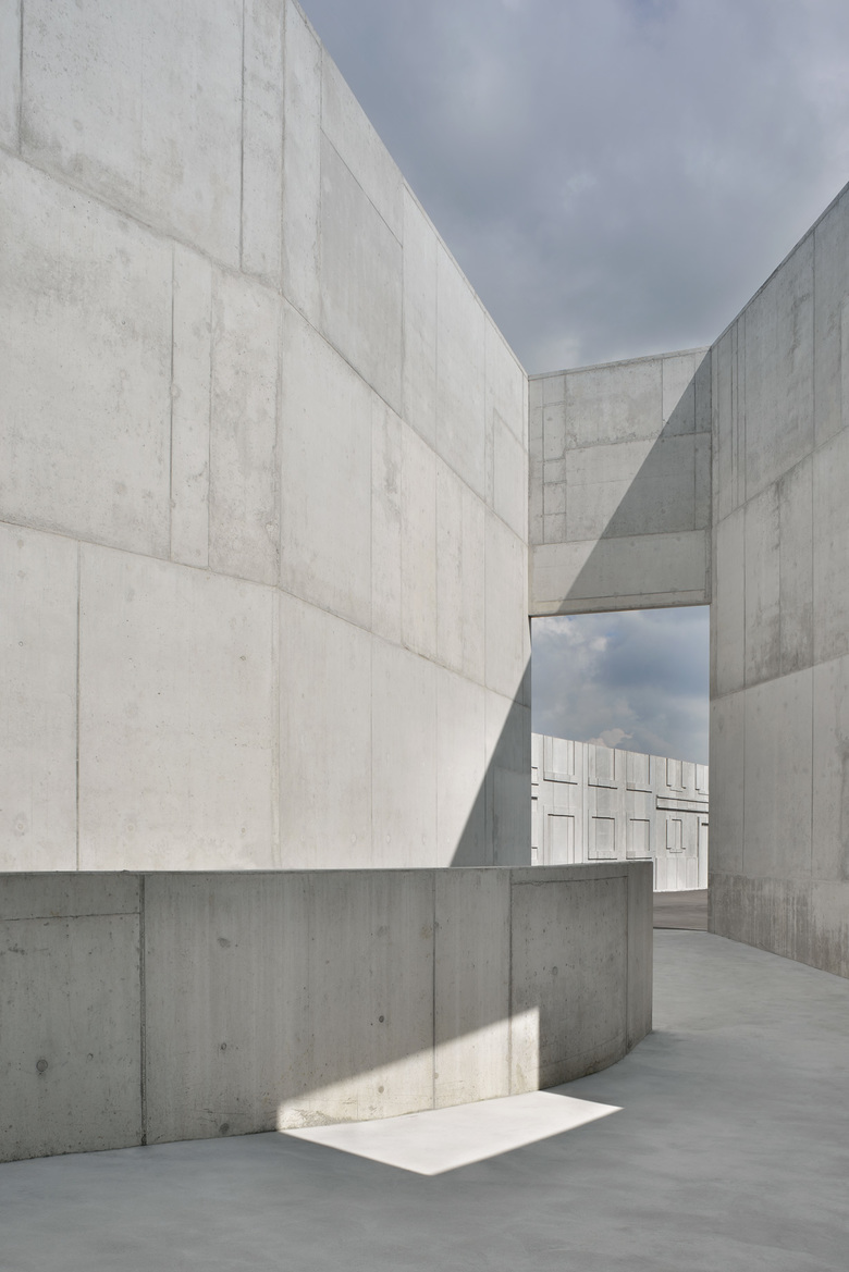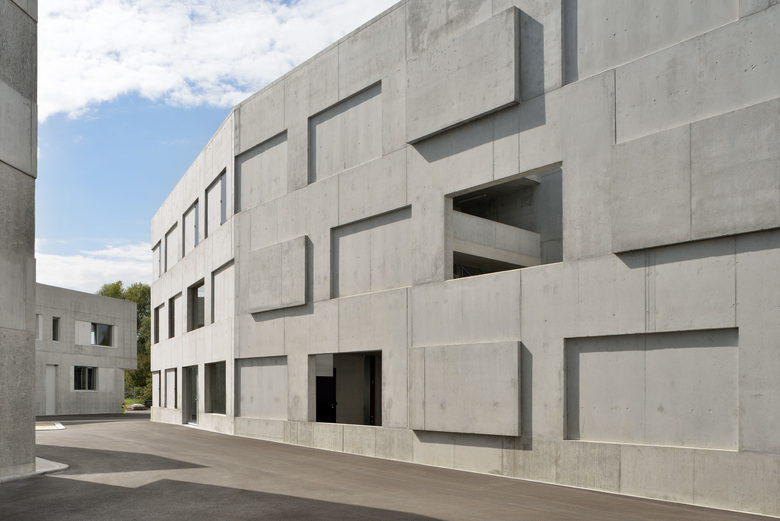 Eine Abschirmwand aus Elementen schützt das nördlich angrenzende Grundstück vor Übungsgeschossen. Ihr Relief deutet Hausfassaden an und verleiht der Abschirmwand einen lebendigen Charakter. Die neuen Bauwerke erfüllen einerseits die komplexen technischen Anforderungen und werden gleichzeitig einem hohen gestalterischen Anspruch gerecht.