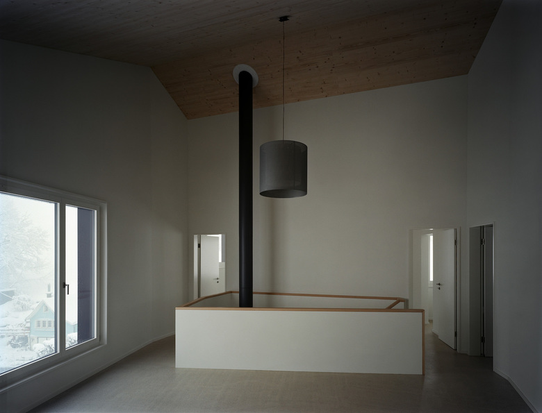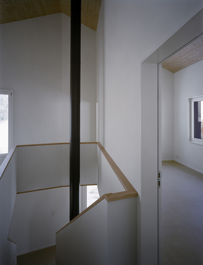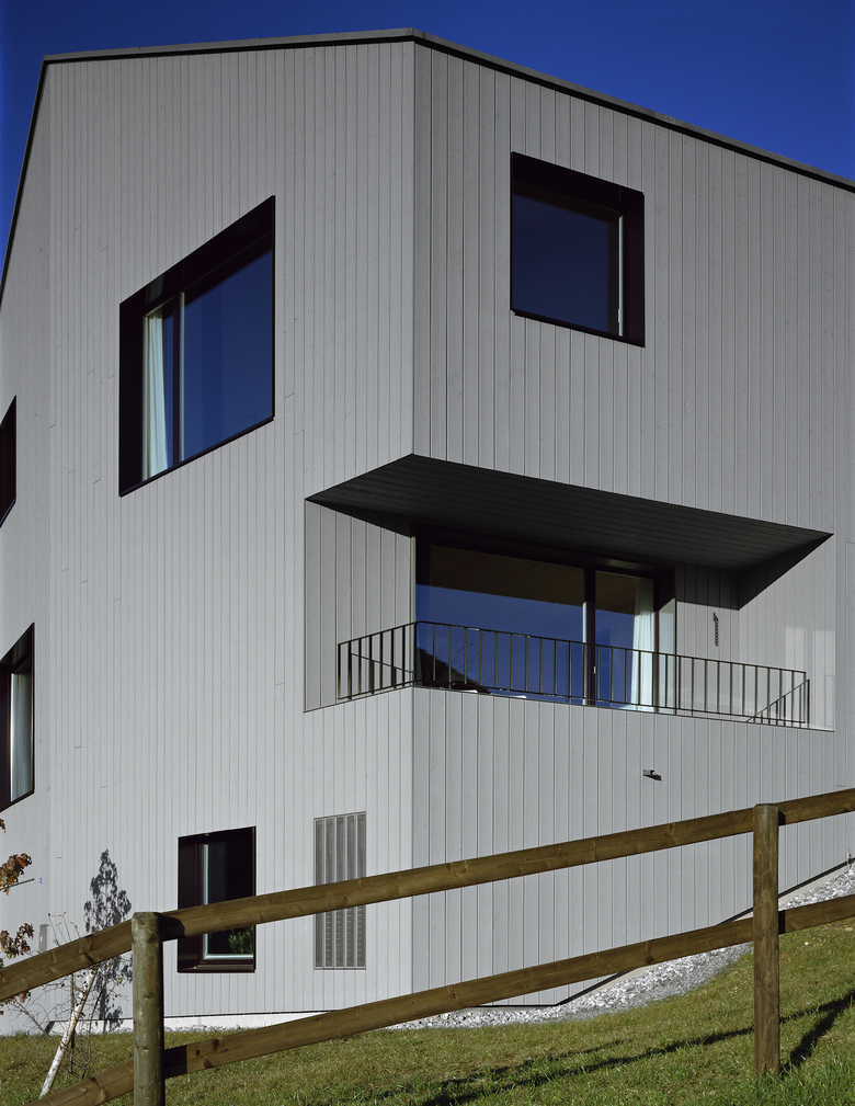 Der Gebäudekörper manifestiert sich in der Magerwiese wie ein kristallines Volumen. Dabei reagieren die abgeknickten Gebäudeseiten auf die spektakulären Ausblicke an das nahegelegene Alpsteinmassiv. Ein geschossübergreifender Wohnraum bildet das grosszügige Zentrum des Hauses. Ein fein detailierter Treppenkörper wirkt darin vertikal als verbindendes Element. Bergseitig flankiert eine durchgängige Schicht sekundärer Räume diesen zentralen Raum. Der Sockel ist massiv betoniert. Darauf aufbauend sitzt in Elementbauweise ein präziser Holzbau aus vorgefertigten Wand- und Dachelementen. Der ganze Gebäudekörper ist mit einer sägerohnen Vertikalschalung aus europäischer Fichte verkleidet.