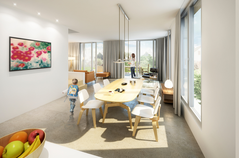 Jede Familie hat ihren eigenen Hauseingang, der von draussen direkt in die privaten Räume führt und das Gefühl des Eigenheims unterstreicht. Jede Partei besitzt zudem mindestens einen exklusiven Aussenraum, private Kellerräume mit eigener Waschküche und unabhängiger Haustechnik sowie einen Parkplatz direkt vor der Haustüre. Die vier Maisonette-Wohnungen sind mit je 4 1/2 Zimmern zwischen 125 m2 und 135 m2 gross, mit jeweils einem grosszügigen Wohn-Ess-Koch- und einem Schlaf-Geschoss mit drei hellen Zimmern und zwei Bädern mit Tageslicht. Die interne Treppe verbindet alle Geschosse. In den Attika-Wohnungen ergänzt ein interner Lift die Erschliessung. Die Attika-Wohnungen besitzen je zwei Dachterrassen, zu den Gartenwohnungen gehört jeweils ein grosszügiger Garten.