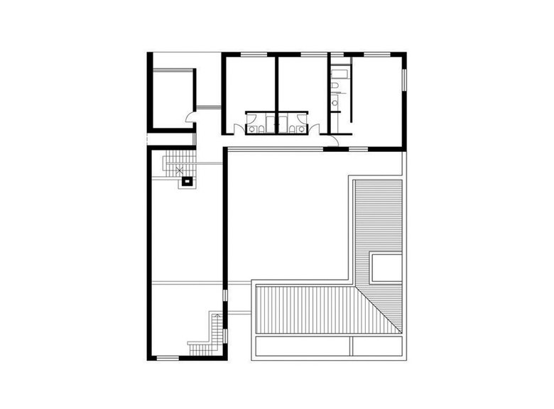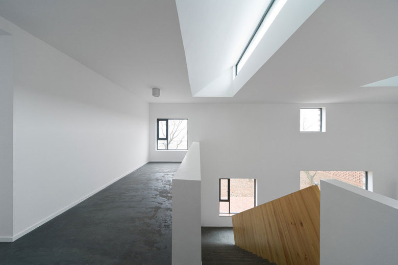 Three different textures of brick skin make up the façade. An interlocking pattern leaves perforations between bricks, and protruding bricks cast shadows along the wall. Windows punctuate the texture, and the brickwork along the edges of these portals further develops abstract geometric relations while remaining loyal to the structural logic.