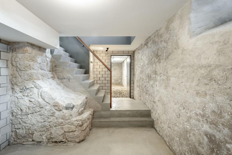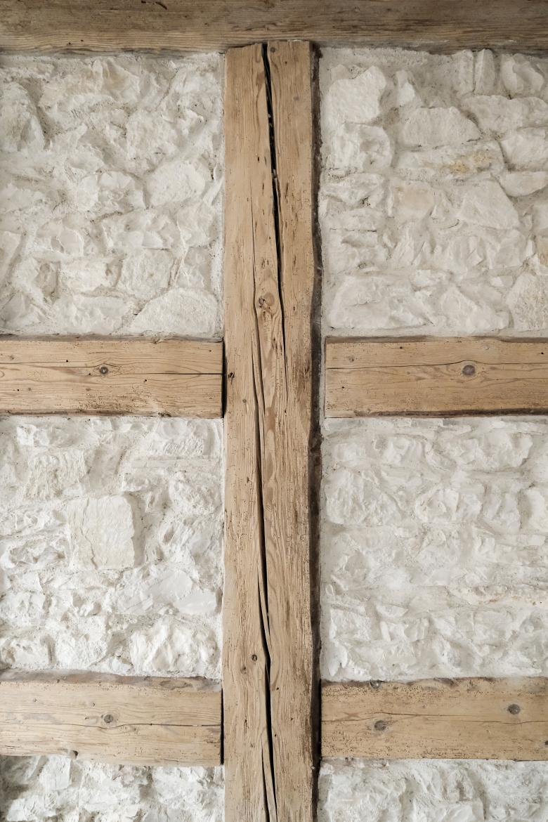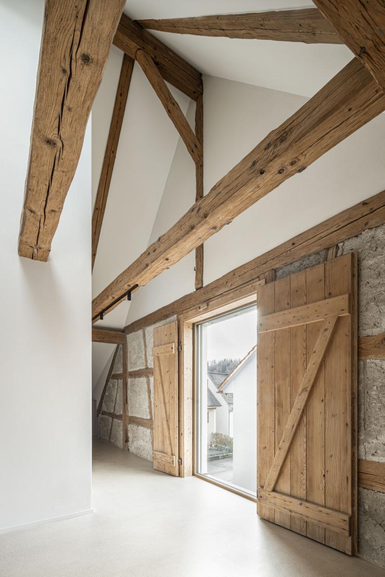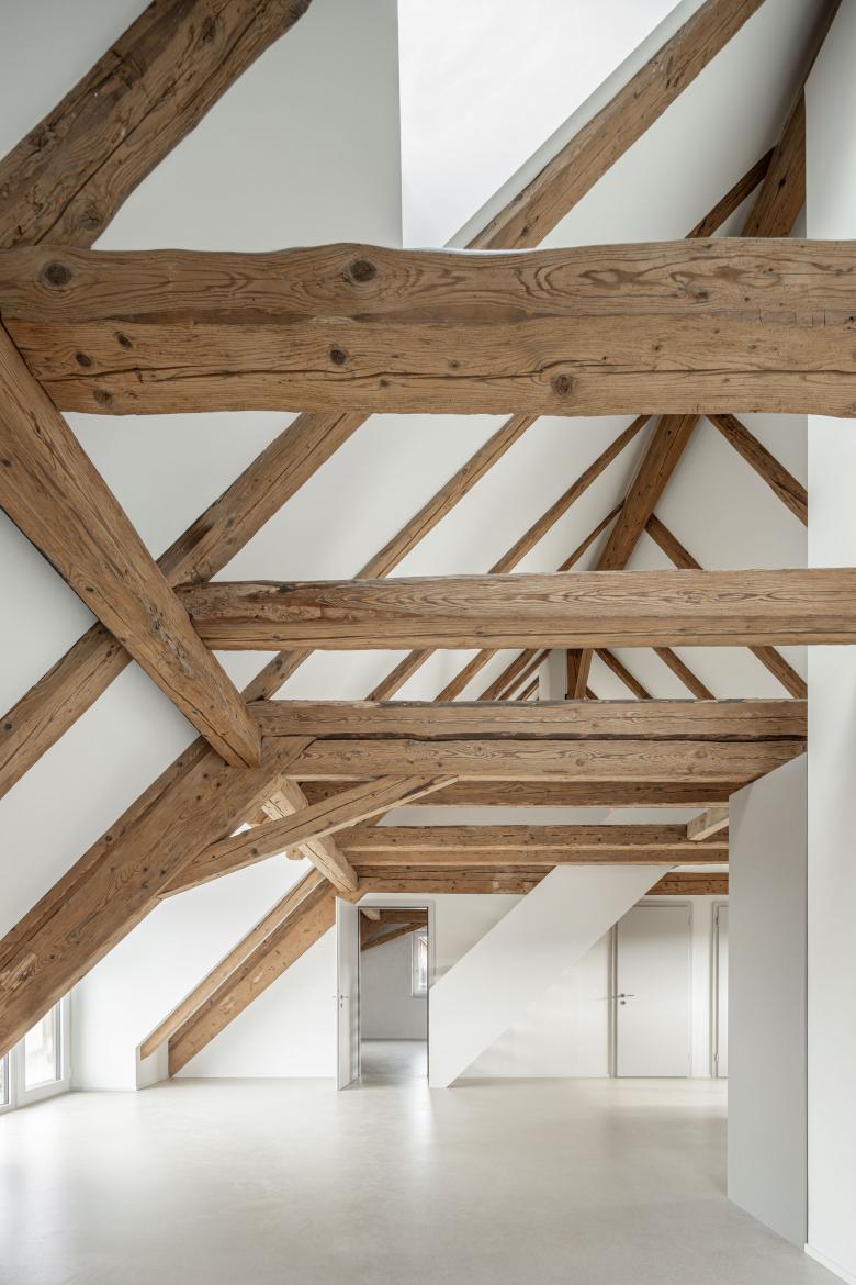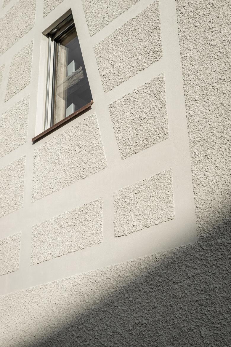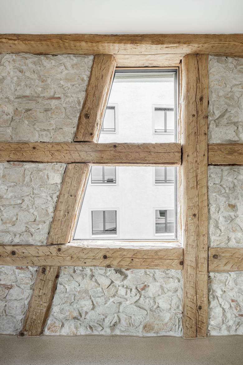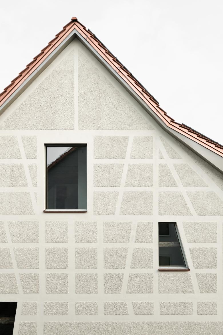 Im Bestand bleibt viel belassen und erhalten. Es entsteht ein besonderer Ausdruck, die Geschichte des Hauses bleibt ablesbar. Der Dachstuhl, die alten Deckenbalken, Fachwerkwände und Bruchsteinwände sind frei gelegt und aufbereitet. Die übrigen Wände erhalten innen einen neuen mineralischem Dämmputz. Das Dach ist aufgedämmt, alle Fenster mit neue Holzfenstern ersetzt. Der Neubau ist als monolithischer Massivbau konzipiert. Das Einsteinmauerwerk wurde innen als auch aussen mit einem mineralischem Kalk-Putz verputzt. Die Dachkonstruktion aus Holz wird mit Tonziegel bedeckt.