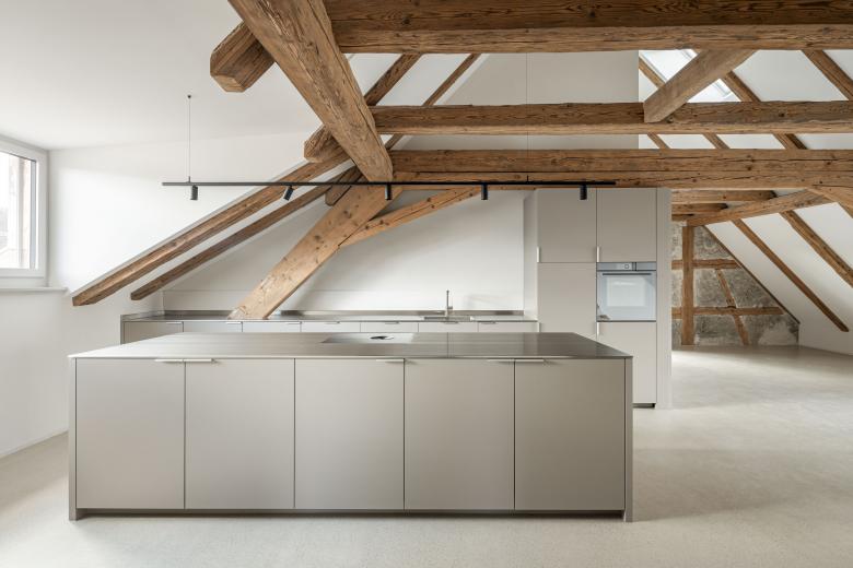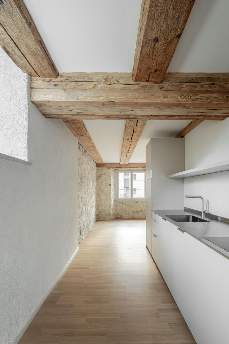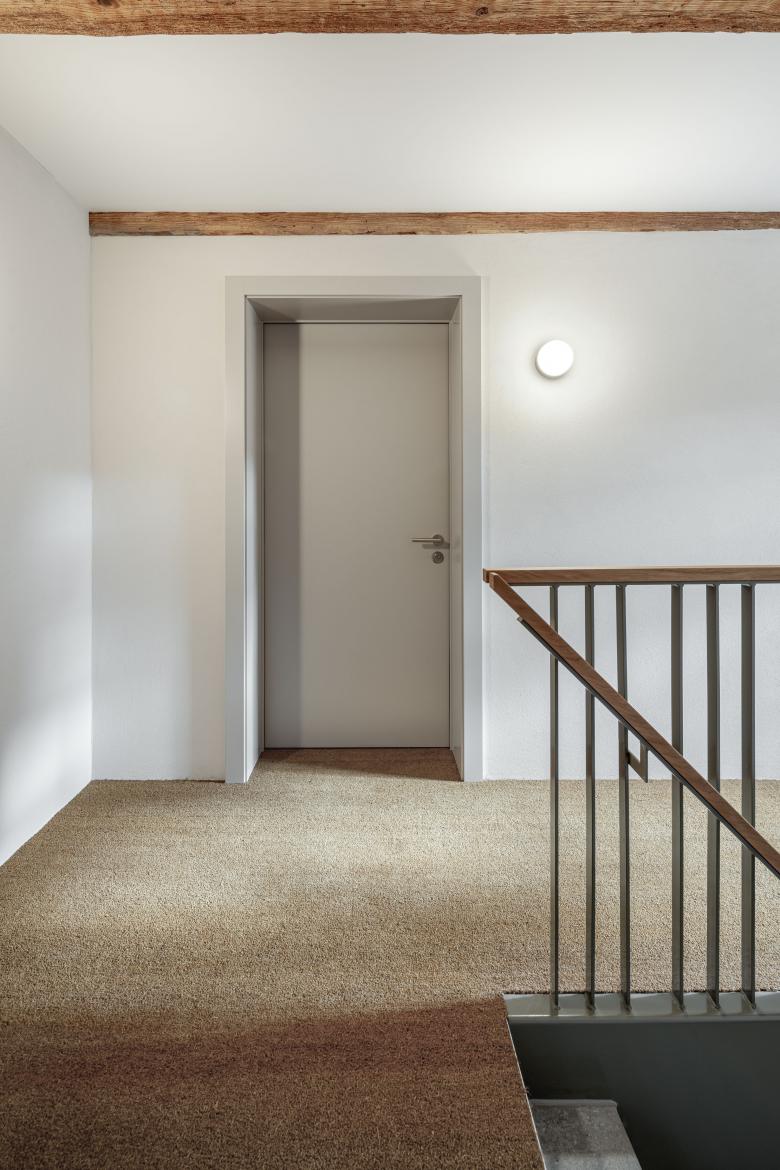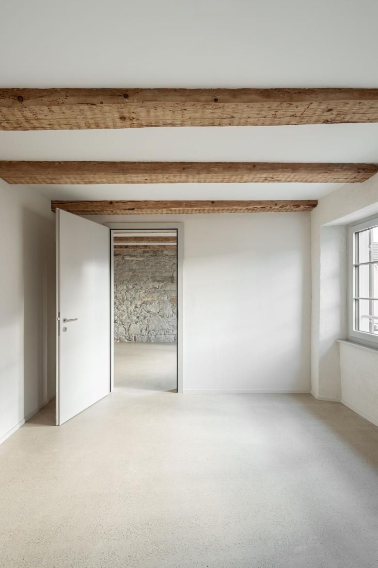 Die Materialwahl wurde kontextbezogen ausgewählt und abgestimmt. Der leicht weiss eingefärbte Anhydritestrich sowie die hellen Oberflächen der Wände und Decken nehmen sich zurück und passen stimmig zu den holzigen Oberflächen der Fenster und Türen sowie der Balken und Bruchsteinwände. Die Verwendung von regionalen und naturbelassenen Materialien entspricht ganz der gewünschten Philosophie und ermöglicht gleichzeitig ein natürliches Klima, welches atmet und entsprechend die Raum- und Luftqualität positiv prägt und aktiv beeinflusst.