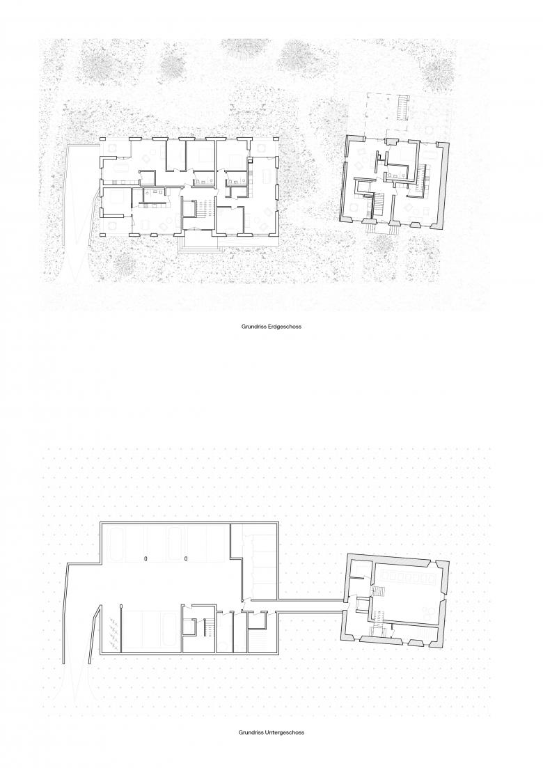 Über einen Verbindungsgang im Untergeschoss werden die beiden Baukörper miteinander verbunden. Die Parkgarage wird von beiden Häusern gemeinsam genutzt. Durch die exzentrisch gesetzten Erschliessungskerne entsteht ein diverser Wohnungsmix: 2.5-, 3-, sowie 3.5-Zimmer-Wohnungen. Alle Wohnungen sind barrierefrei erschlossen. Das Bauernhaus wird hinsichtlich verdichteter Bauweise von einer Wohneinheit in neu 4 Wohnungen transformiert. Der Erschliessungsturm mit Balkonflächen dockt als filigrane Stahlkonstruktion an die nördliche Fassade an und spielt gegenüber dem Bestand zusätzliche Wohnfläche frei.
