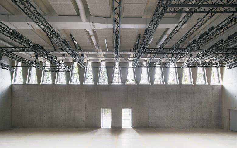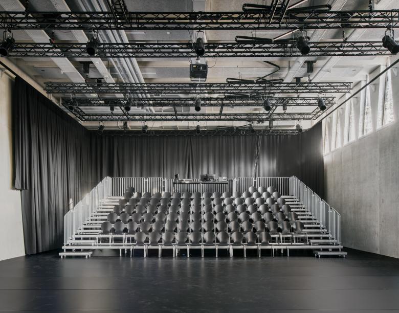 The programme is organized across two levels, separating private uses on the upper level from public uses on the lower one. This division allows for different accesses and activates the circulation around the building, reinforcing its public nature at that level in direct contact with the river Limmat. Here, the main foyer runs over the entire length of the façade and gives access to the production rooms and the main multifunctional hall. This space, which spans two storeys, is provided with daylight on the side. The upper level accommodates the Tanzhaus offices and backstage spaces.