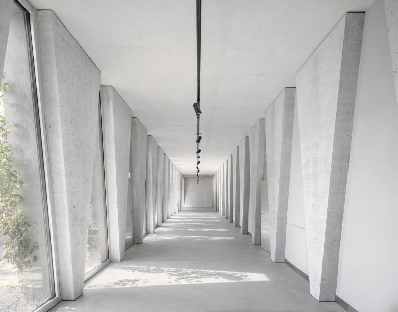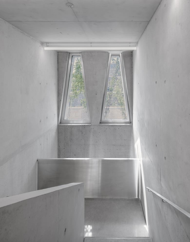 The repetition of the trapezoidal shape that characterizes the alternation between full and empty spaces of the facade follows three main aspects of project: the desire to establish a dialogue between the new building and the context; the need to have a certain mass of material for structural issues but, at the same time, a permeable relation with the exterior public space; the obligation for legislation to control and limit the entry of sunlight into the building, in parallel with the intention of avoiding the use of mechanical sun screening systems or of systems that introduced a further material alongside the 'pure' reinforced concrete structure.