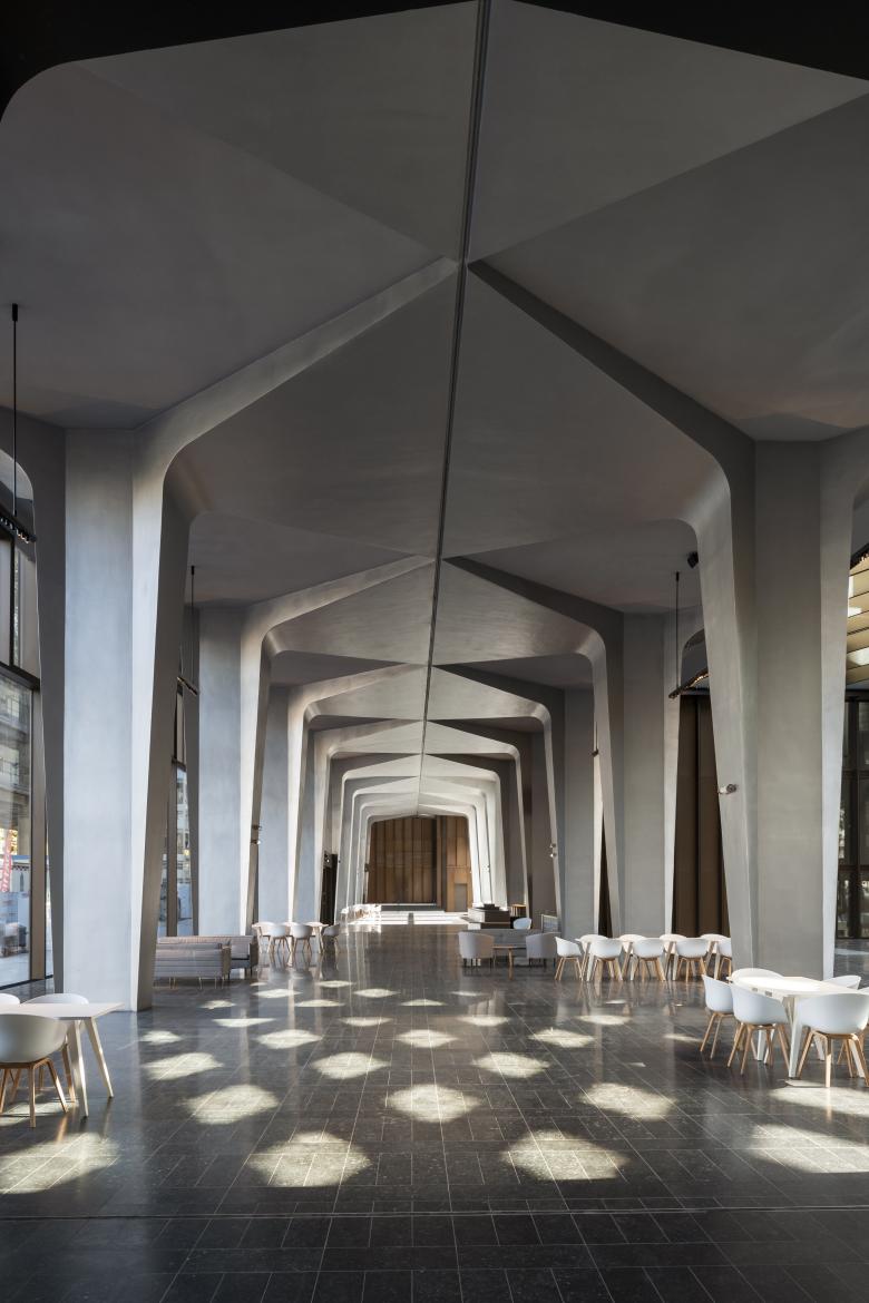 Parterre und Teile des ersten Untergeschosses öffnen das Haus für die Allgemeinheit: Dort finden sich Restaurants, Cafés und ein Auditorium mit 200 Plätzen. Recycling im Detail: Im Fußboden der Galerie mit ihren markanten Betonsäulen und ihrer Kirchenschiffhöhe werden Granitsteine aus der Fassade des Originalgebäudes verarbeitet. Die Mehrzahl der Erschließungskerne wird für den künftigen Bedarf umgestaltet; Panoramalifte und ein monumentales Treppenhaus markieren die Haupterschließung