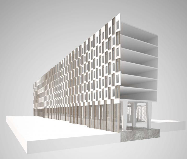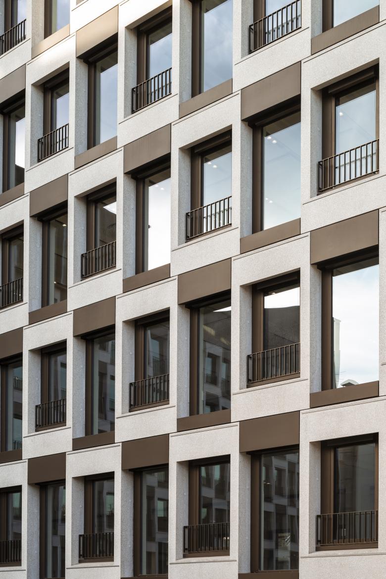 Die Fassade an der Avenue wird auf heutige Baustandards gebracht, ihre Struktur bleibt erhalten. Auskragende Fenster-Kästen aus Bronze verstärken thermisch wie ästhetisch die bestehenden Fensteröffnungen. Die Kästen verfügen über unterschiedliche Tiefen, sodass sich ein neuer Rhythmus ergibt. Elementaren Momente der Architektur werden auf diese Weise umgesetzt: Plastizität und selbst gewählte Ordnung finden sich zu einer Fassade, welche der Adresse und dem Projekt „75, Avenue de la Grande Armée“ eine starke Physiognomie verleiht.