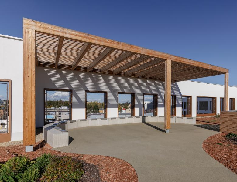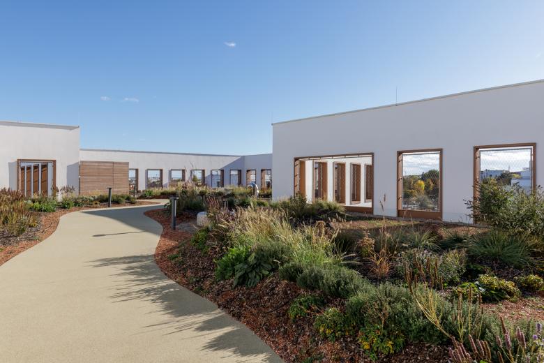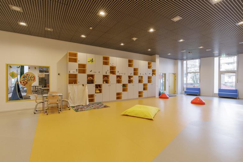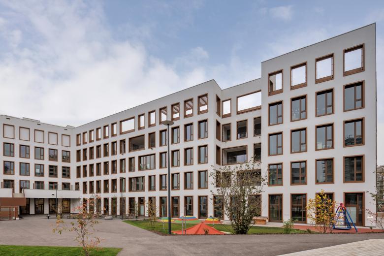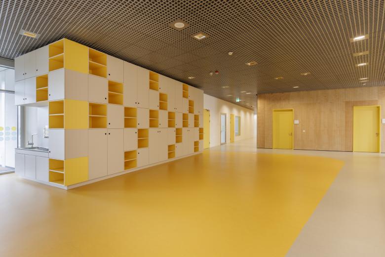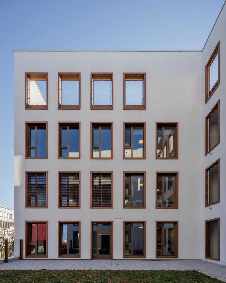 Ein neuer Ort im Quartier – Der neue Bildungscampus Atzgersdorf soll die soziale Infrastruktur im Stadtbezirk sicherstellen sowie hohe Energieeffizienz und Wirtschaftlichkeit bieten. Die Umsetzung: Der neue Campus nimmt in drei Trakten acht Bildungsbereiche und drei Kindergruppen für 1.100 Schüler*innen auf. Entlang der vielfrequentierten Breitenfurter Straße zeichnet die Anlage eine klare Raumkante, während sie sich zum ruhige-ren Areal und dem benachbarten Grünraum hin öffnet. Die einzelnen Bildungsbereiche formen in sich abgeschlossene Gebäudeteile, die von der großzügigen Kommunikationszone erreicht werden. Dies ermöglicht die Interaktion von halböffentlichen Bildungsbereichen und dem allgemeinen Schulraum. Die Merkmale: Signifikant für die Kommunikation zwischen Innen und Außen sind die tiefen Einschnitte in den hell verputzten Fassaden, welche die Blickperspektiven erweitern. Die Materialität der Schule vermittelt Wertbeständigkeit, wie auch die Offenheit für neue, modular organisierte Bildungskonzepte in der Struktur begründet liegt. Innovativ ist zudem die Organisation des Energieeintrages: Kompakte Bauvolumina, präzise gesteuerte Lüftung sowie Photovoltaik und Erdwärme sorgen für optimale Effizienz.