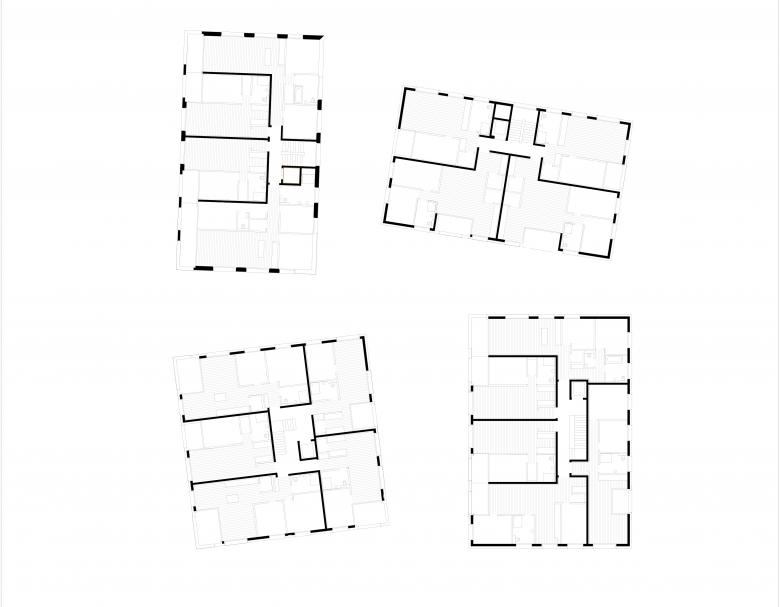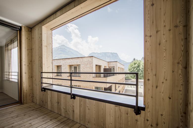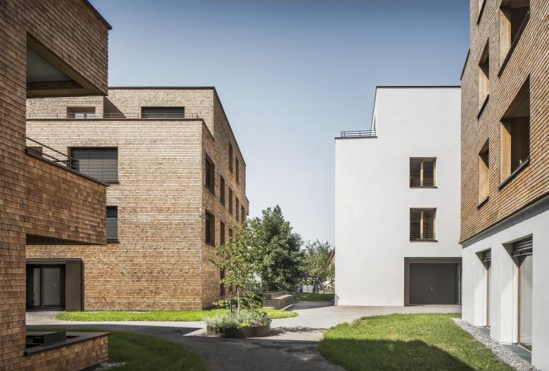Zwei der insgesamt vier Baukörper bilden ein Entree, leiten von der Straße in die Tiefe des begrünten Areals mit seinem gemeinsamen Platz. Bei der hohen Dichte der Bebauung haben unsere Kolleginnen und Kollegen echte Maßarbeit geleistet. „Raum ist die Beziehung zwischen den Dingen“ hat Adolf Loos einmal geschrieben. In Dornbirn wurde sie Wirklichkeit. Bereichert um ein wichtiges Moment der Wahrnehmung: Die vier Wege zum Platz hin verjüngen oder erweitern sich, Blickperspektiven ändern sich – ein Ort entsteht, Spannung entsteht.