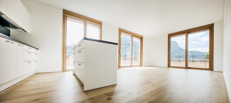 Die Wohnungen mit ihren zwei oder vier Zimmern in den kompakten Bauköpern sind meist über Eck‘ gestellt, sodass die Blickperspektiven erweitert und das räumliche Erleben bereichert wird. Obwohl die Häuser rechteckig sind, wurde der Campus V in Dornbirn eine runde Sache.