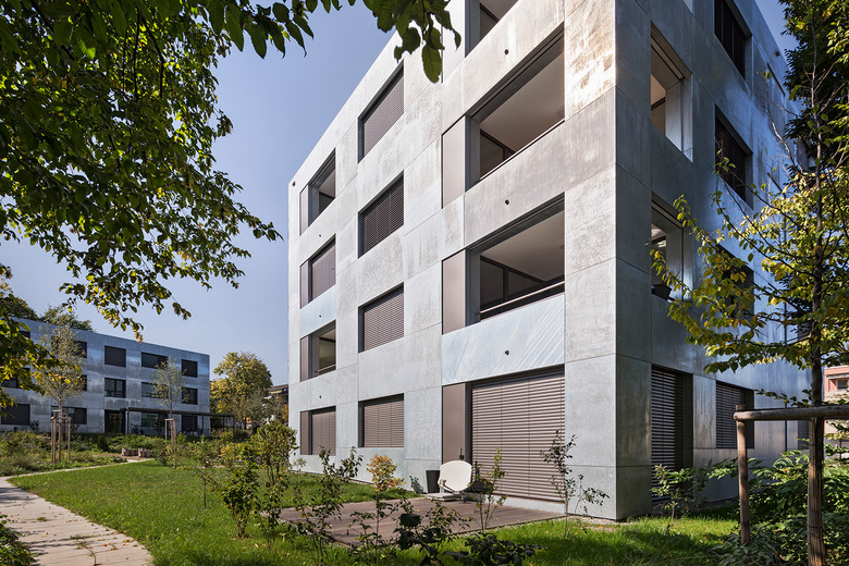 Glänzender Auftritt im üppigen Grün – Wie schimmernde Kristalle, eingebettet in üppiges Grün, wirkt die Wohnüberbauung am Chilestieg in Rümlang, Schweiz. Bei der städtebaulichen Planung hat baumschlager eberle sich sensibel an der Bebauung in der Umgebung orientiert. Der sechseckige Zuschnitt der Baukörper und eine Fassade aus feuerverzinktem Stahlblech geben den drei Mehrfamilienhäusern einen markanten Auftritt auf dem Grundstück, das von einem gewachsenen Baumbestand eingefasst ist. Die Häuser sind drei- und viergeschossig und bieten insgesamt 41 Wohnungen.