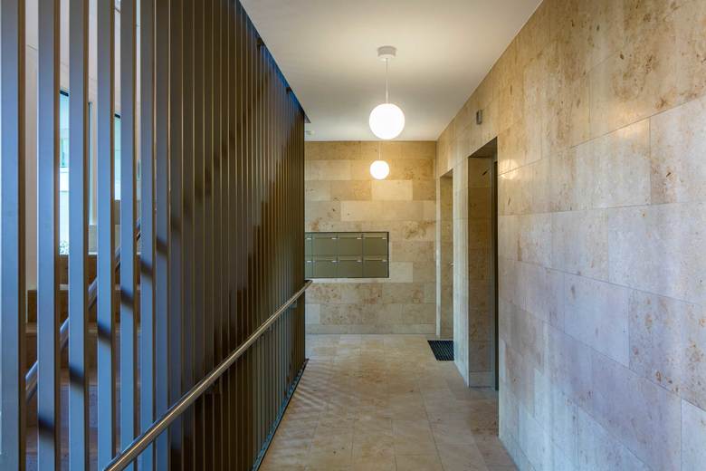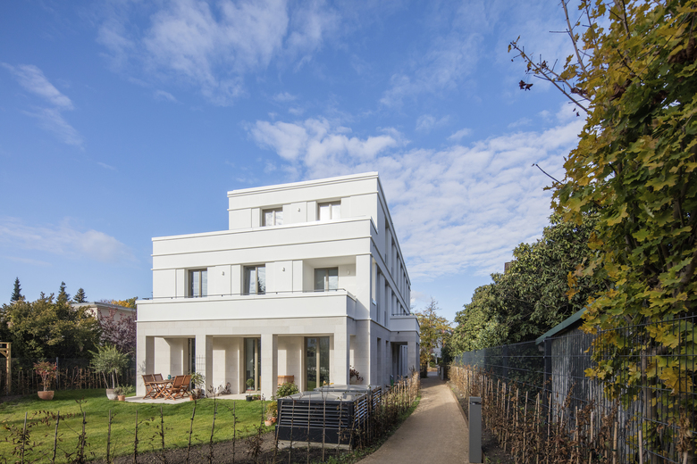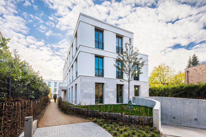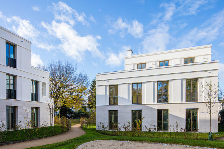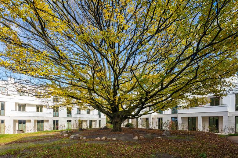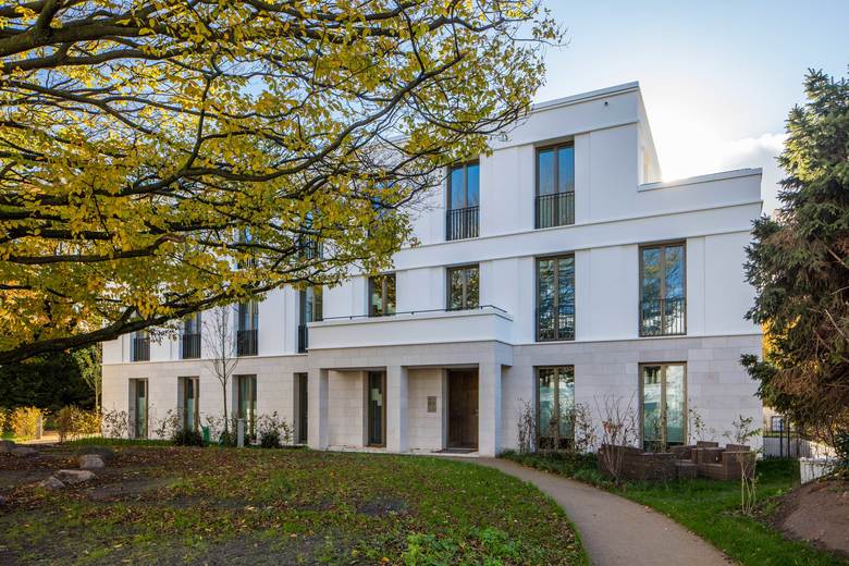 Das Ensemble mit vier Einzelbaukörpern vermittelt zwischen den Nachbargebäuden. Ein Riegel, der an der Bernadottestraße seinen Hochpunkt findet, markiert den Auftakt des Ensembles. Die übrigen drei Baukörper arrangieren sich um eine markante Hainbuche im Zentrum des privaten Parks. Alle 24 Wohnungen verfügen über großzügige Freiräume. Die Gebäude sind in feinem Putz gehalten; Sockel und vorgelagerte Arkaden wurden in Naturstein gefasst – sie verleihen dem Ensemble seinen vornehmen Charakter. Für die Gliederung der Geschosse sorgen Schichtpilaster und zartes Gebälk an den oberen Gebäudeabschlüssen. Really British – wie man es in Hamburg gewohnt ist. Das Hamburger Büro von Baumschlager Eberle Architekten weiß, wie das geht.