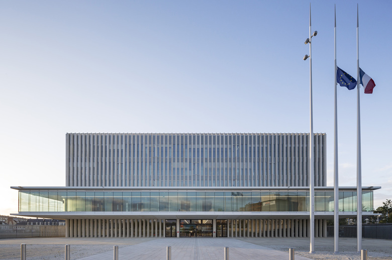 Fundamental und transparent – Das Justizgebäude von Caen befindet sich auf der Halbinsel von Caen, im Zentrum der Stadt. Das Projekt, von Baumschlager Eberle Architekten und dem Atelier Pierre Champenois nach einem ursprünglichen Entwurf des Büros Christian Hauvette realisiert, machte es sich zur Hauptaufgabe, der Bedeutung der Institution Ausdruck zu verleihen. Architektur und Rechtsprechung, simple Geometrie und essentieller Teil des sozialen Lebens treffen aufeinander. Das Gebäude bringt seine Umgebung optimal zur Geltung und trägt dazu bei, einen geschützten öffentlichen Ort in einem sich im Wandel befindenden Viertel zu schaffen.