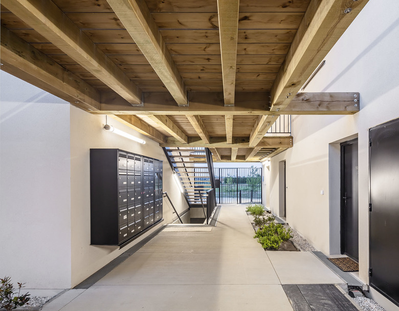 Die Anlage zeichnet sich nicht nur durch ihre Verortung in der Peripherie aus. Sie ist, obwohl es widersprüchlich klingen mag, sehr urban: Gemeint ist damit, die Abstufung des Öffentlichkeitsgrades von der Straßenkante bis hin zu den Wohnungen. Da gibt es zunächst den gemeinsamen Innenhof und dann die Bereiche mit stärkerer Intimität. Etwa unter den Decken der Holzkonstruktion oder den bewusst abgesetzten Zugängen der Wohnungen, die im Parterre über kleine Blumenbeete verfügen. Highlights der optionalen Kommunikationsschiene sind die Schnittstellen zwischen den beiden Baukörpern: Dort entstanden Treffpunkte mit Blick auf die Umgebung. Apropos Umgebung: Die Loggien als private Freiräume runden das Angebot einer sehr stimmigen und unaufdringlichen Choreographie von Öffentlichkeit und Privatleben ab.