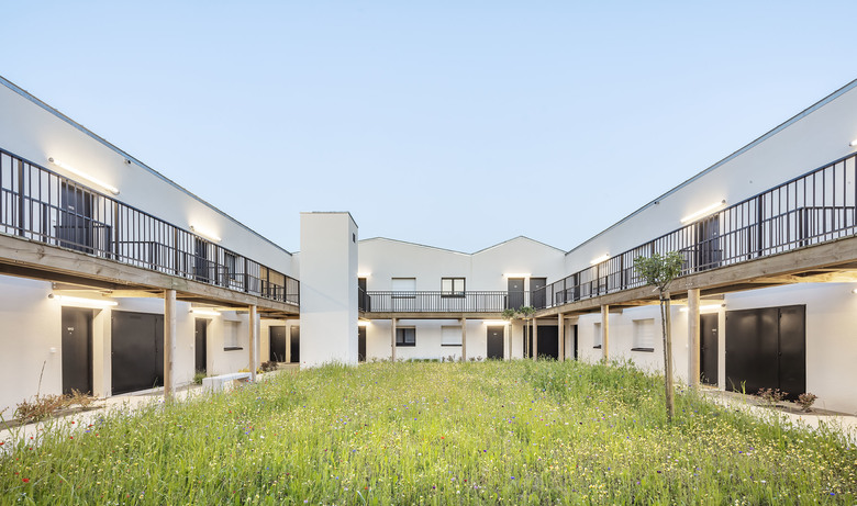 Architektur ist nicht von den Kosten abhängig – dieses Credo setzen Baumschlager Eberle Architekten seit Jahrzehnten erfolgreich um. Auch der jüngste soziale Wohnbau in Bretteville-sur-Odon spricht dafür. An der Peripherie von Caen (Normandie) gelegen, wurde mit dem „Le Patio“ ein kompaktes, prägnantes Volumen mit 27 Wohnungen realisiert, das räumlich und typologisch überzeugt. Zwei l-förmige Bauteile mit Öffnungen zur Umgebung umschließen den natürlich begrünten Innenhof. Eine Holzkonstruktion erschließt die obere Etage der Anlage, luftig und materialgerecht.