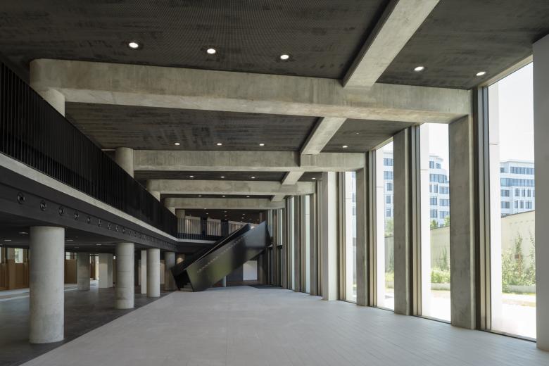 Im Erdgeschoss, das sich zur Rue Anatole France hin öffnet, liegt eine für alle zugängliche Ebene. Das Vestibül ist durchlässig und modulierbar; es umfasst auf doppelter und dreifacher Höhe die Eingangshallen zu den Büros, einen großen Coworking-Restaurantbereich, eine Lobby und ein Foyer.