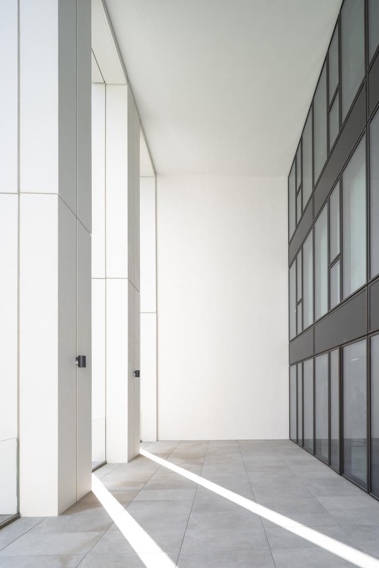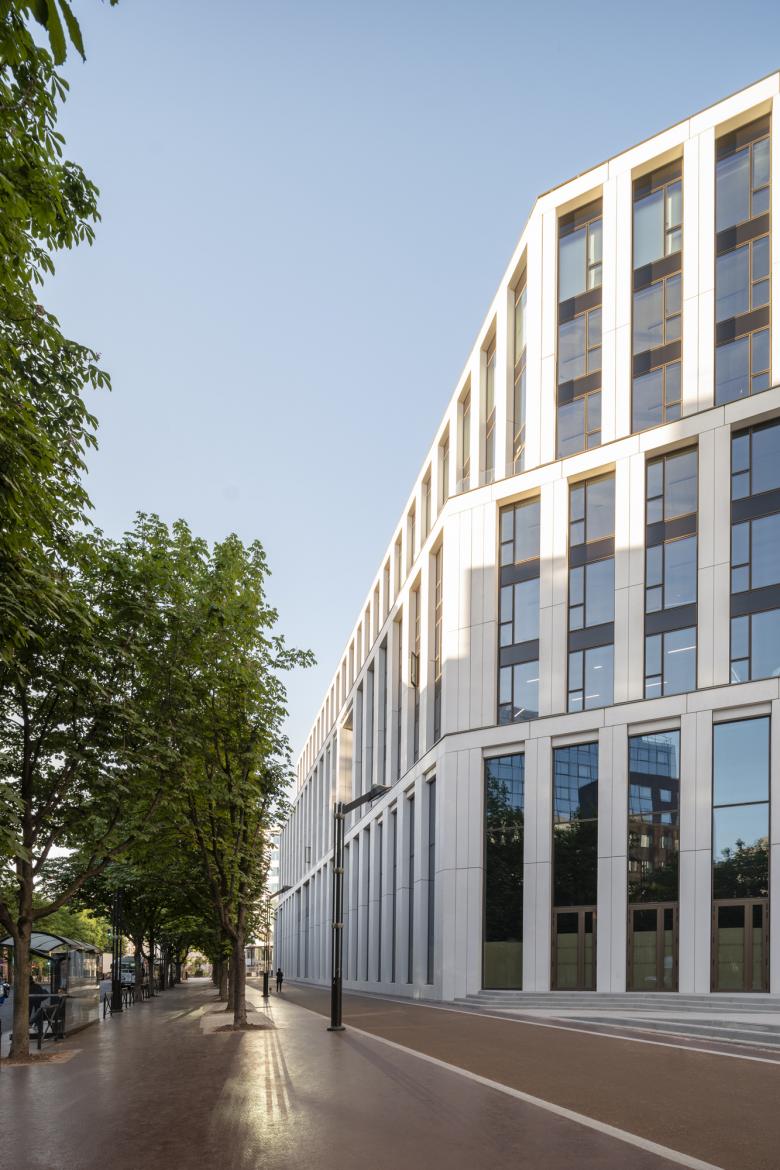 Um dem Objekt ein emblematisches Image zu verleihen, erhielt die Gebäudehülle besondere Beachtung: Über den ästhetischen Aspekt hinaus trägt sie maßgeblich zur nachhaltigen und umweltfreundlichen Gestaltung bei. Die Fassaden wurden nach dem Prinzip von drei übereinander liegenden Bändern behandelt. Bestehend aus Sockel, Körper und Attika, verbinden sie jeweils drei Stockwerke, um den Eindruck einer aufgeteilten Gebäudevolumetrie zu vermitteln. Fassadenrücksprünge und -überhänge verstärken diesen Eindruck.