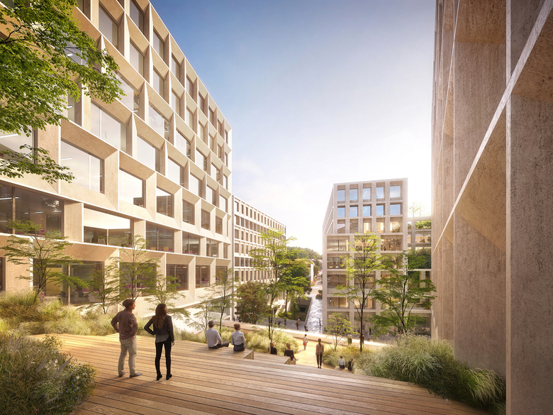 Die künftige Zentrale der Tochter der österreichischen Erste Bank, zusammengefasst im „Campus ue new HQ Česká Spořitelna, wird 4 Baukörper umfassen. Die Campus-Häuser von Baumschlager Eberle Architekten sind im hohen Maß nutzungsneutral und damit flexibel einzurichten. Für die Fassaden wurde ein System entwickelt, das ebenso variabel wie einfach auszuführen ist. Rechteckige oder dreieckige Wandscheiben rahmen hoch- und querformatige Fenster. Dieses Rahmenwerk und die unterschiedlichen Fensterproportionen lassen sich punktgenau der jeweiligen topografischen und belichtungstechnischen Situation der Gebäude anpassen.